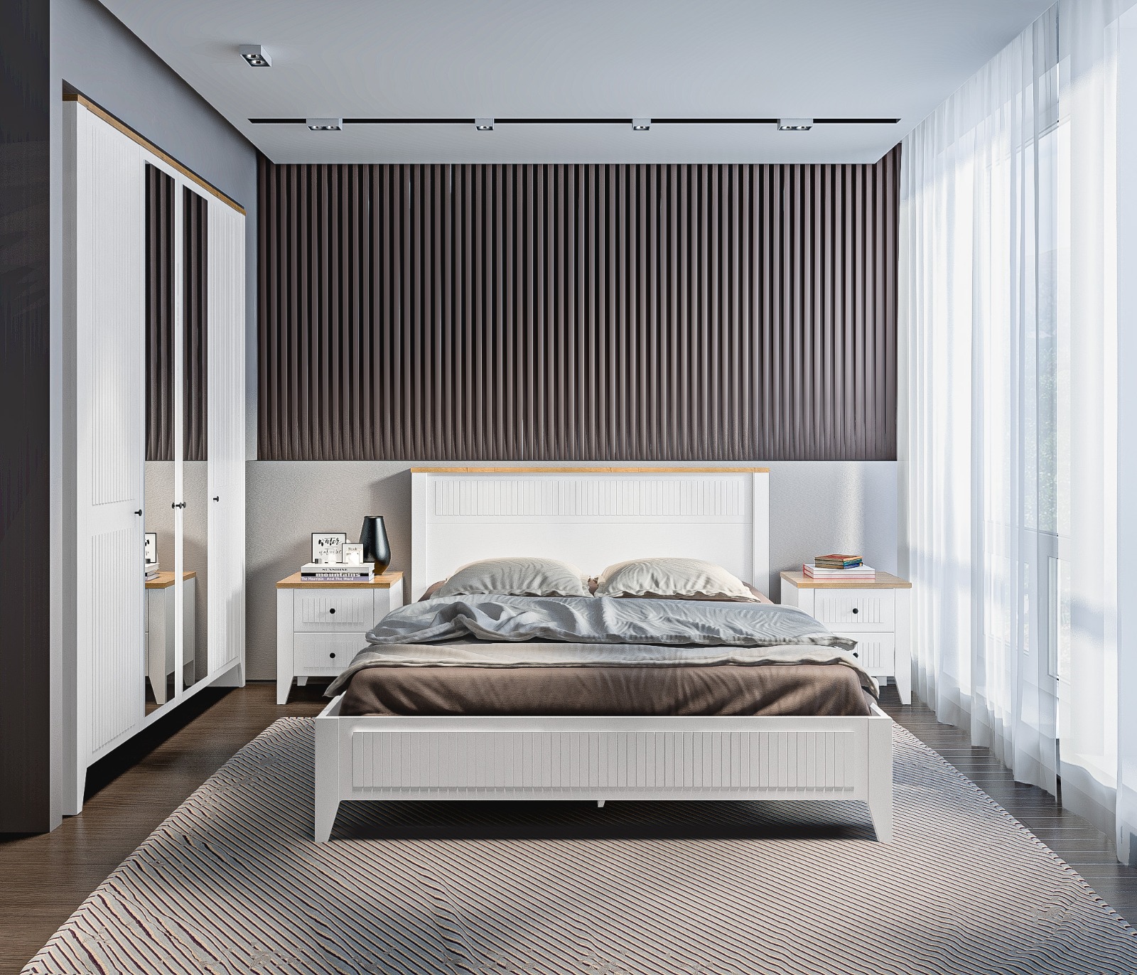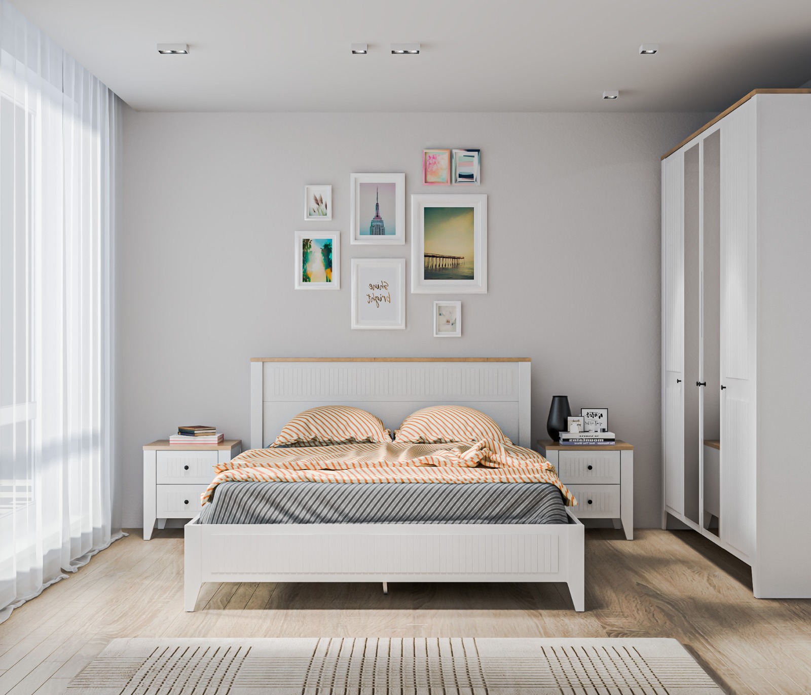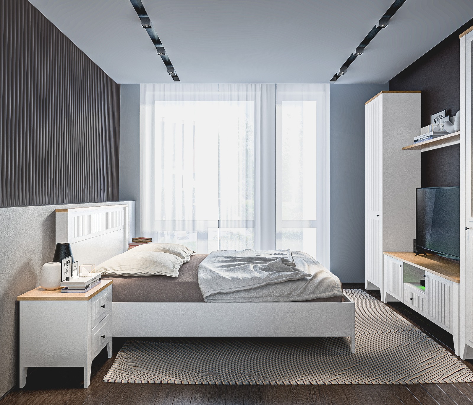• Спальня выполнена в нежном и светлом оттенке Белый Альпийский, который визуально расширяет пространство и придаёт комнате лёгкость.