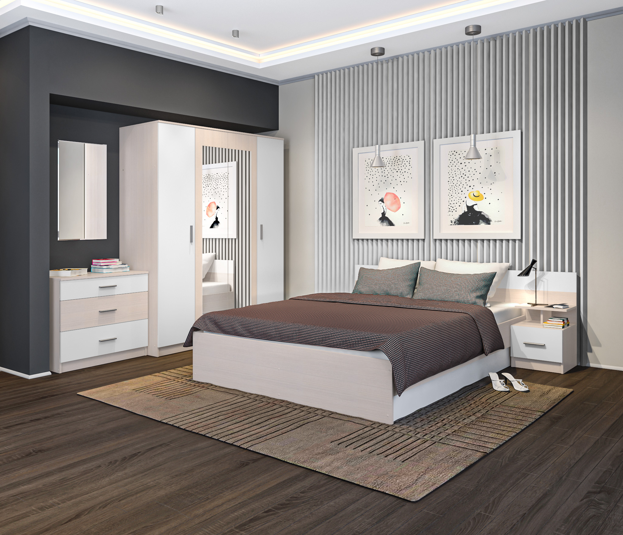 Такое цветовое решение придает спальне свежий внешний вид, добавляя нотку элегантности в ваш интерьер. Комплектация набора включает в себя все необходимое для уютного пребывания в спальне: