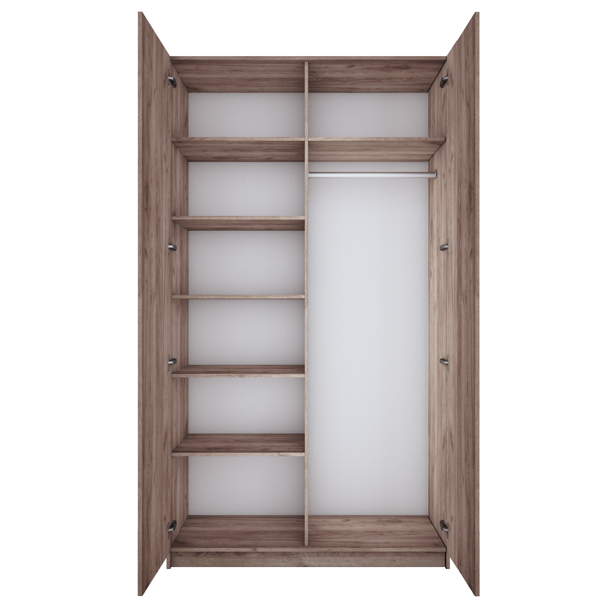Благодаря надежным полкодержателям - штифтам, полки шкафа могут выдерживать до 15 кг, штанга выдерживает нагрузку до 60 кг. Вы сможете убрать сезонные вещи, постельное белье на верхние полки. Распашной шкаф оснащен долговечной, ударостойкой кромкой ПВХ, которая защищает его торцы от сколов и повреждений, что обеспечит вам комфортное и долгое использование гардероба. Распашная система дверей Titus B-Type обеспечивает надежное прилегание дверцы к корпусу шкафа и высокую износостойкость. Механизм не деформируется при значительных нагрузках и максимально практичен в эксплуатации. Шкаф оснащен удобной минималистичной ручкой, изготовленной из алюминия. В производстве используется безопасное ЛДСП международного класса Е1, что способствует безопасному использованию на протяжении всего срока эксплуатации.