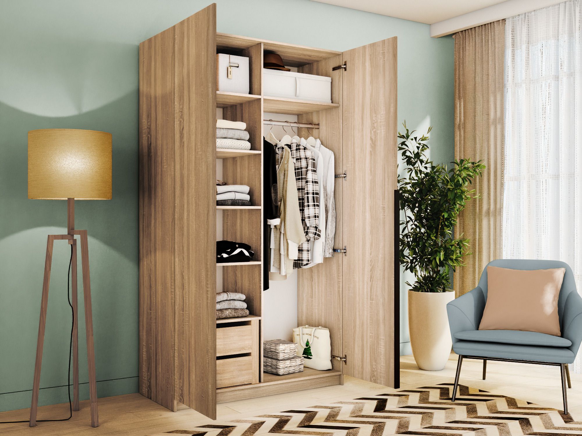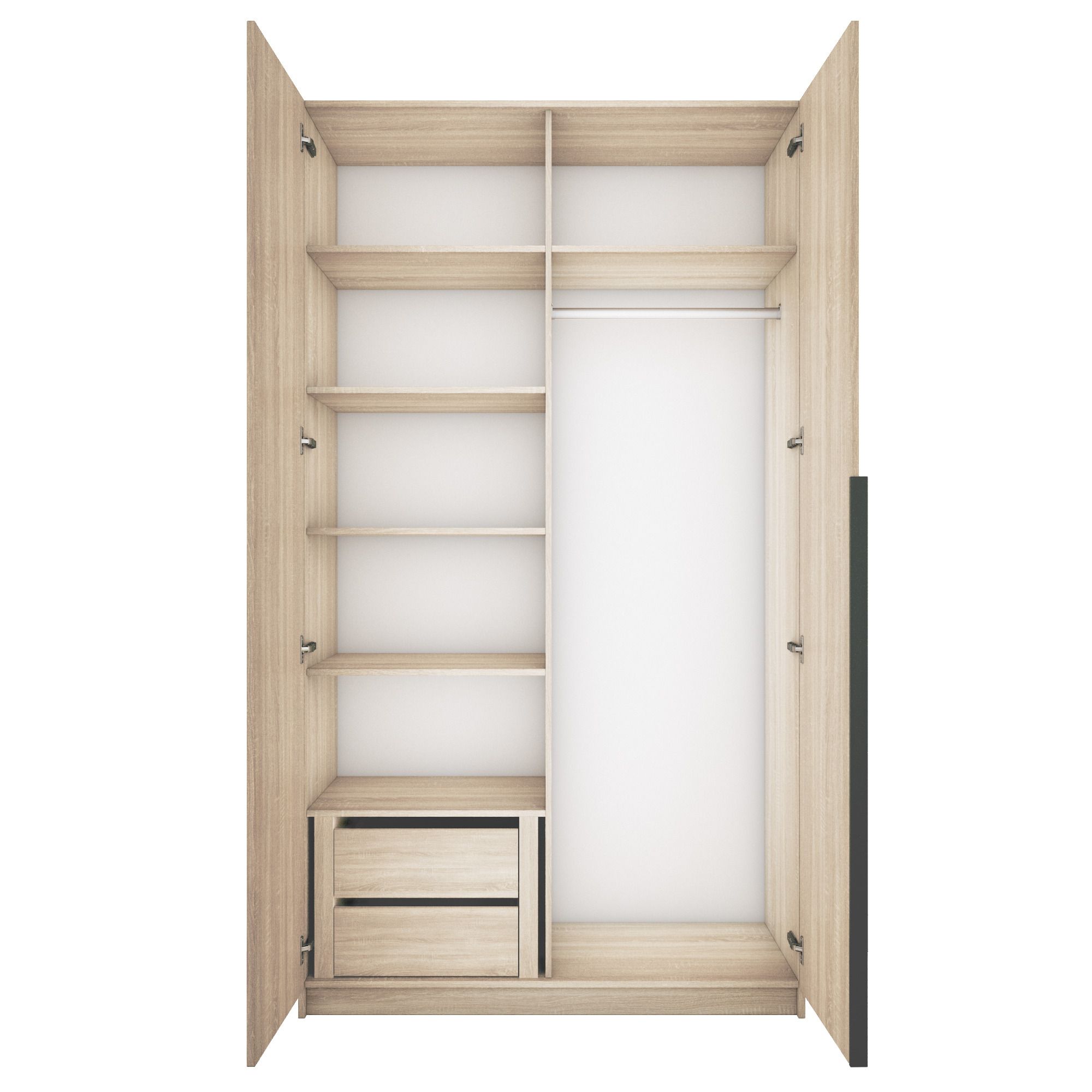 Благодаря надежным полкодержателям - штифтам, полки шкафа могут выдерживать до 15 кг, штанга выдерживает нагрузку до 60 кг. Вы сможете убрать сезонные вещи, постельное белье на верхние полки. Распашной шкаф оснащен долговечной, ударостойкой кромкой ПВХ, которая защищает его торцы от сколов и повреждений, что обеспечит вам комфортное и долгое использование гардероба. Распашная система дверей Titus B-Type обеспечивает надежное прилегание дверцы к корпусу шкафа и высокую износостойкость. Механизм не деформируется при значительных нагрузках и максимально практичен в эксплуатации. Шкаф оснащен удобной минималистичной ручкой, изготовленной из алюминия. В производстве используется безопасное ЛДСП международного класса Е1, что способствует безопасному использованию на протяжении всего срока эксплуатации.