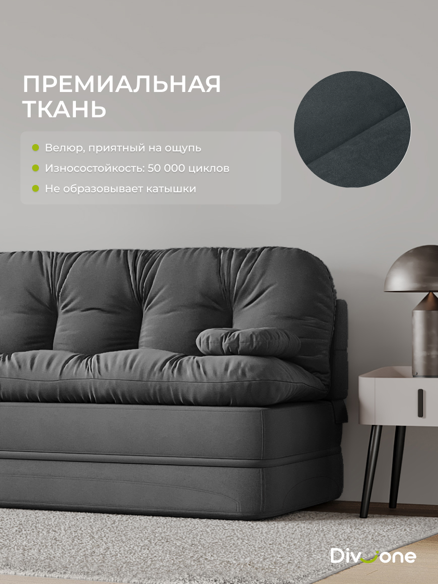 Мы понимаем, насколько важна целостность визуального образа. Именно поэтому наша коллекция включает кресла, выполненные в аналогичных цветовых решениях. Наши бескаркасные диваны трансформеры для городской квартиры и загородной дачи изготовлены из материалов высокого качества. Основа выполнена из ППУ (Пенополиуретан) толщиной сорок сантиметров, что обеспечивает упругость. Велюр имеет износостойкость — 50 000 циклов по тесту Мартиндейла, что более чем вдвое превышает стандартные требования (20 000). Наполнение верхнего матраса и декоративных подушек представляет собой смесь упругой поролоновой крошки и воздушного синтепуха. Такой состав препятствует быстрой усадке, эффективно поддерживает первозданную форму изделия и продлевает его срок службы на долгие годы. Таким образом, долговечность и сохранение превосходного внешнего вида гарантированы. Не требует сборки. Спецпредложение! Спешите купить товар с гарантия качества от производителя по выгодной цене.