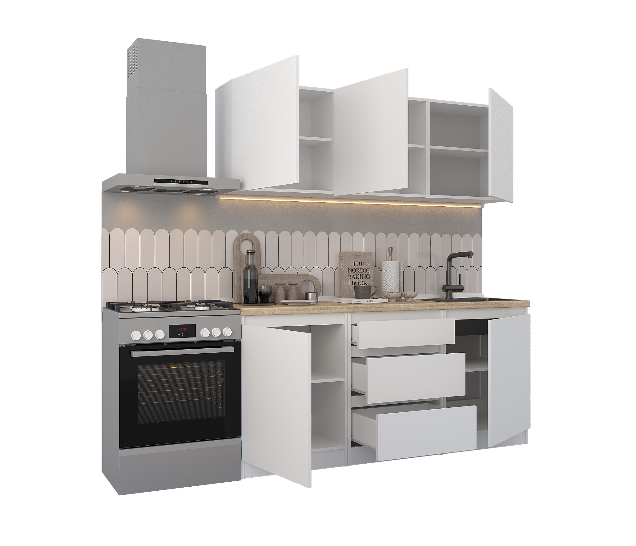 Кухня Леон сочетает в себе функциональность, стиль и доступность, и является прекрасным выбором для тех, кто ищет компактное и удобное решение для своей кухни. Кухонный гарнитур Леон идеально подходит для помещений с ограниченным пространством. Корпус и фасады выполнены из белого ЛДСП. Фасады столов и шкафов не имеют лицевой фурнитуры и открываются захватом за тыльный край фасада. Леон смотрится современно, а отсутствие ручек упрощает уход за поверхностью.