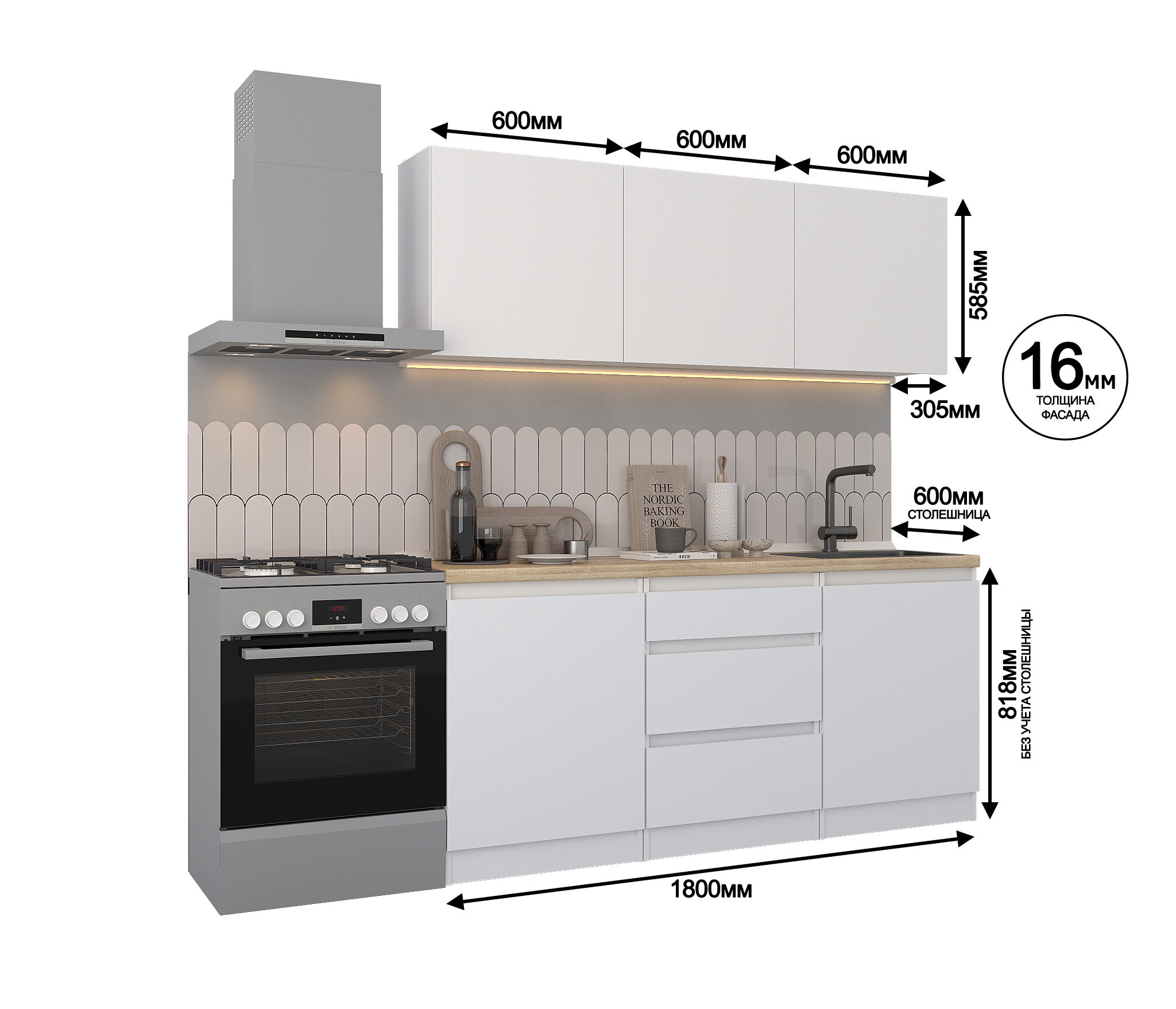 Кухонный гарнитур Леон прямой 180 см, белый (Белый)