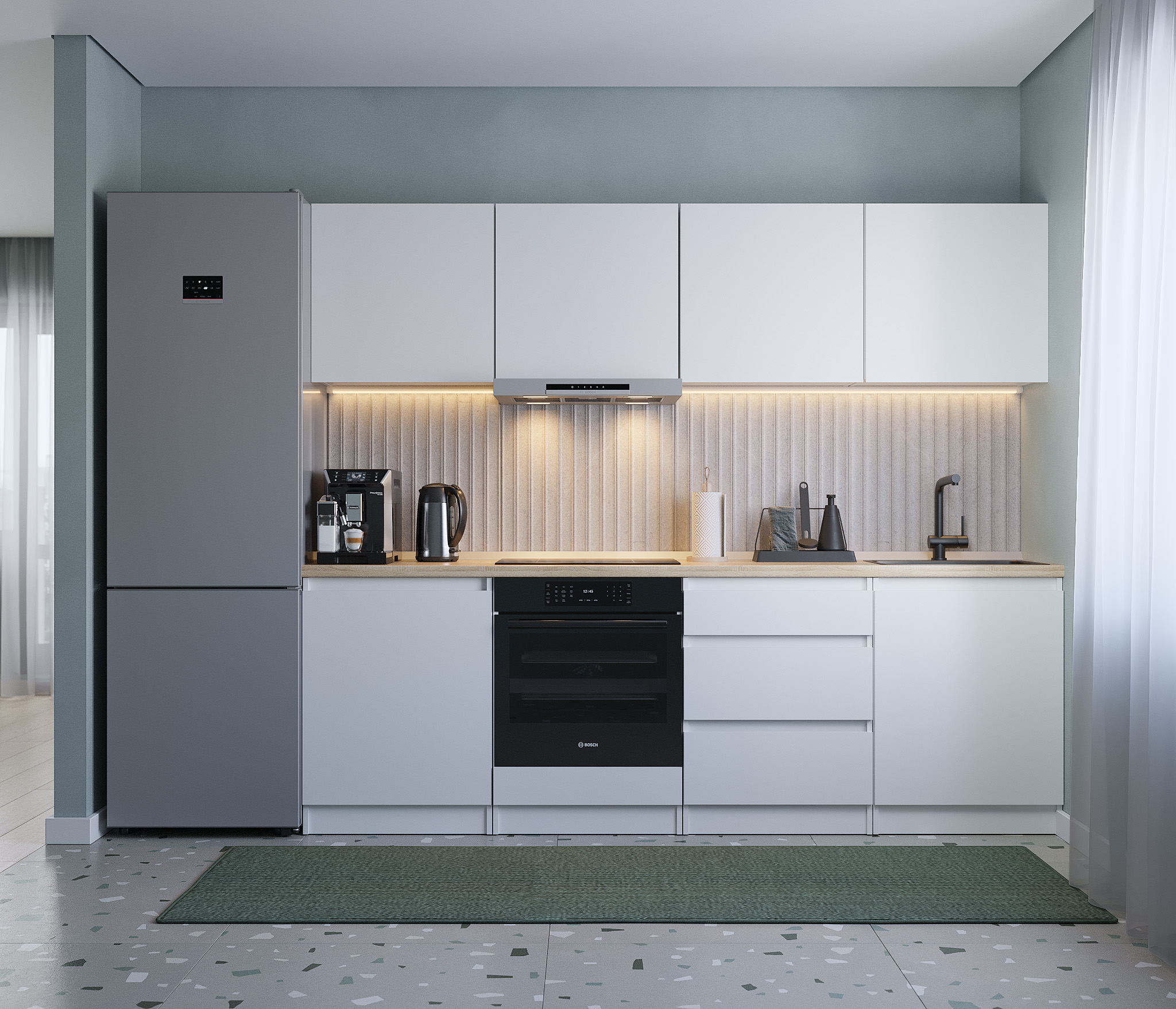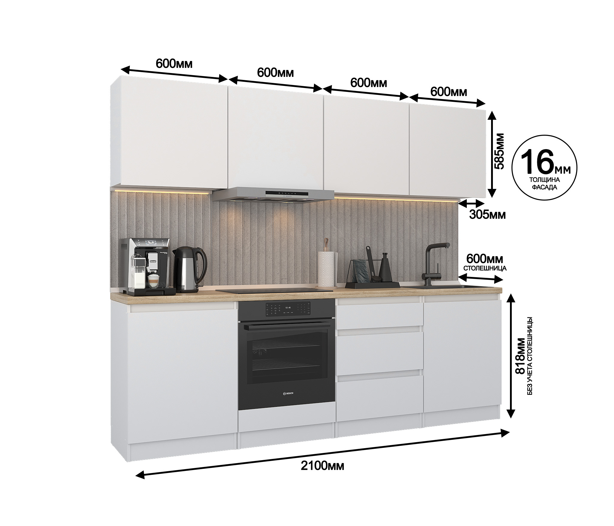 Кухня Леон сочетает в себе функциональность, стиль и доступность, и является прекрасным выбором для тех, кто ищет компактное и удобное решение для своей кухни. Кухонный гарнитур Леон идеально подходит для помещений с ограниченным пространством. Корпус и фасады выполнены из белого ЛДСП. Фасады столов и шкафов не имеют лицевой фурнитуры и открываются захватом за тыльный край фасада. Леон смотрится современно, а отсутствие ручек упрощает уход за поверхностью.