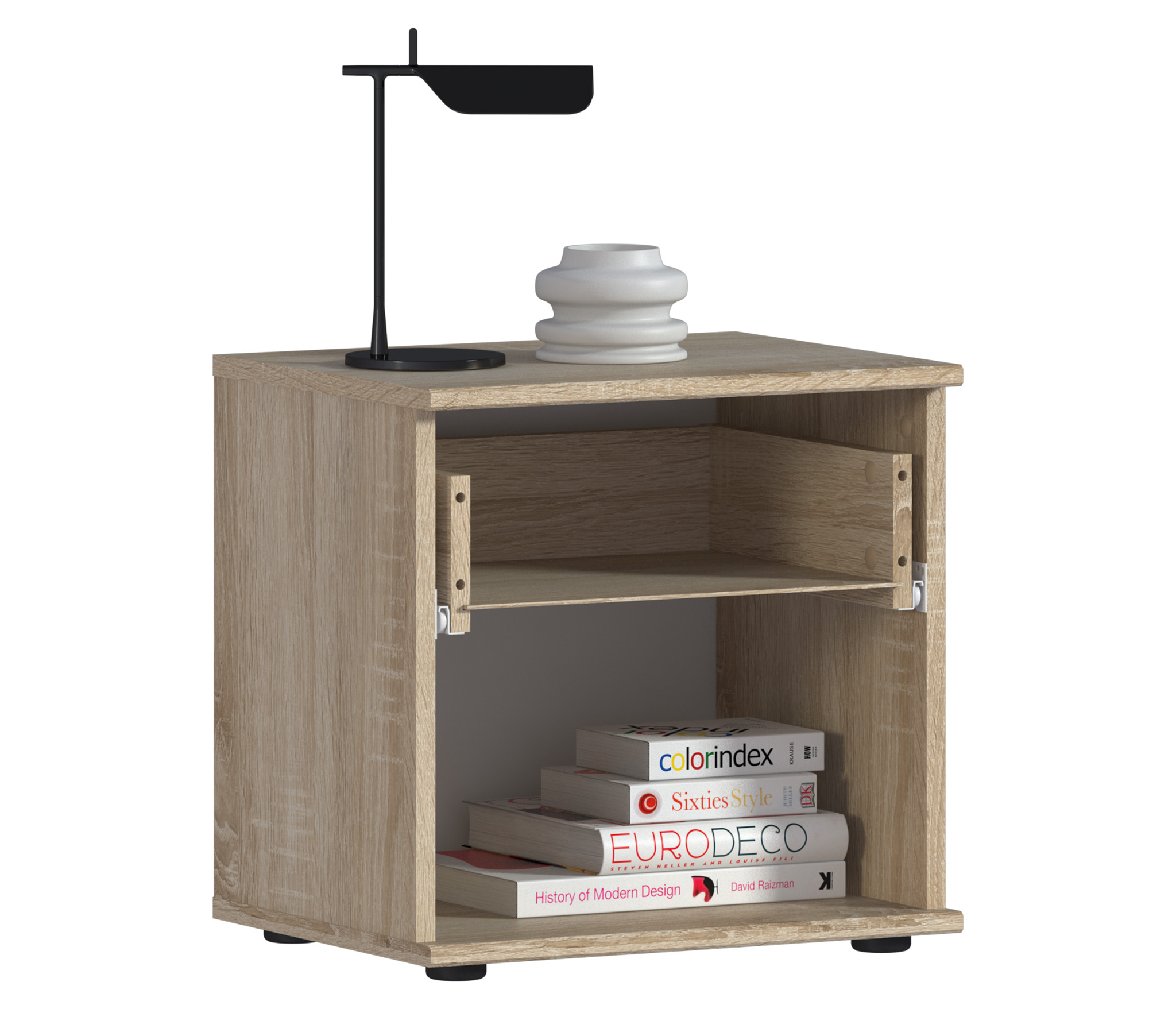 Габаритные размеры - ширина 45 см, высота 44 см, глубина 35 см. Под ящиком расположена открытая полка. Модель выполнена из КДСП. Благодаря корпусу с текстурой под дерево и белым фасадом тумба может с успехом использоваться и в классических, и в суперсовременных интерьерах.