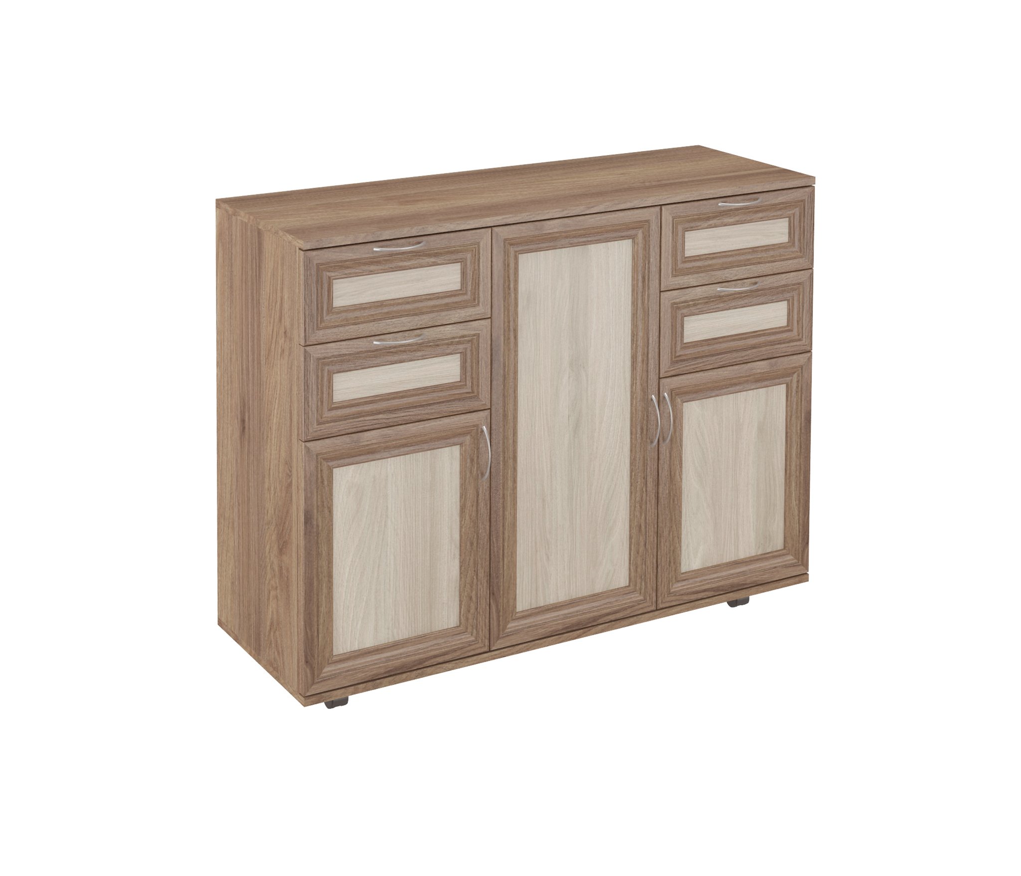 Комод 3 отличается многофункциональностью и большими размерами.оснащён выдвижными ящиками и дверками,скрывающими полки.Ножки из пластика,корпус ЛДСП,фасады рамочные МДФ.