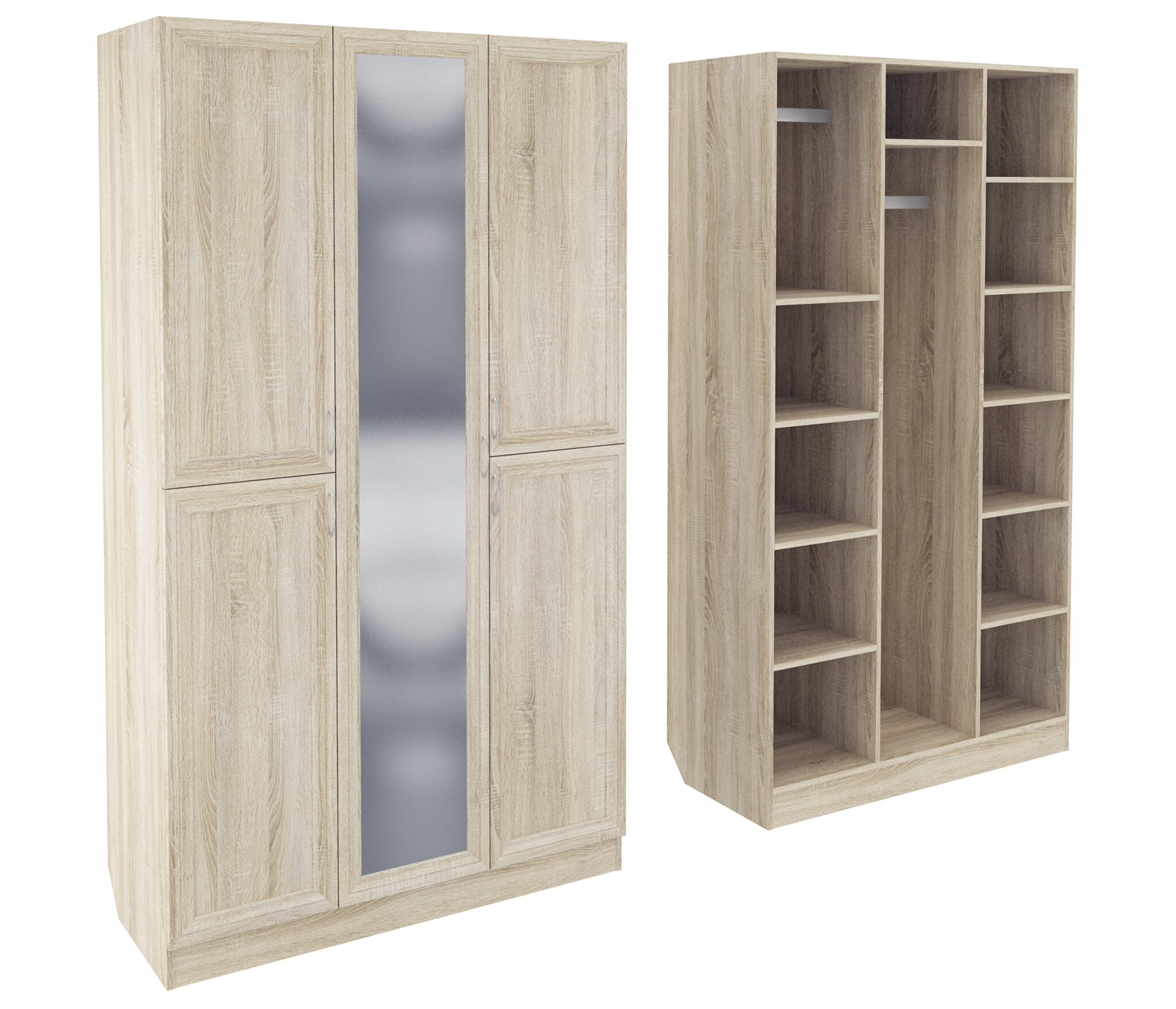 Корпус шкафа выполнен из Ламинированной ДСП высокого качества с насыщенным цветом. Фасады выполнены из материала МДФ.Шириною 120 см., большая и функциональная модель с отделениями закрытыми на пять распашных дверей. Вверху слева небольшое отделение со штангой, внизу слева две полки. Справа за двумя дверьми шесть ниш. За центральной дверцей сверху узкая ниша и отделение со штангой.В данной моделе установлено зеркало, которое вмонтировано на производстве в рамку фасада двери шкафа.