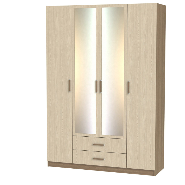 Феникс М-15 Корпус шкафа выполнен из Ламинированной ДСП высокого качества с насыщенным цветом..В данной моделе используются зеркала, .Шириною 140 см., красивый и удобный четырехстворчатый шкаф. По бокам слева и справа секции, по четыре полки в каждой. В центре сверху узкая ниша, под ней большая секция со штангой для одежды. В самом низу два выдвижных ящика. Два зеркала в данной моделе уже включены в стоимость.