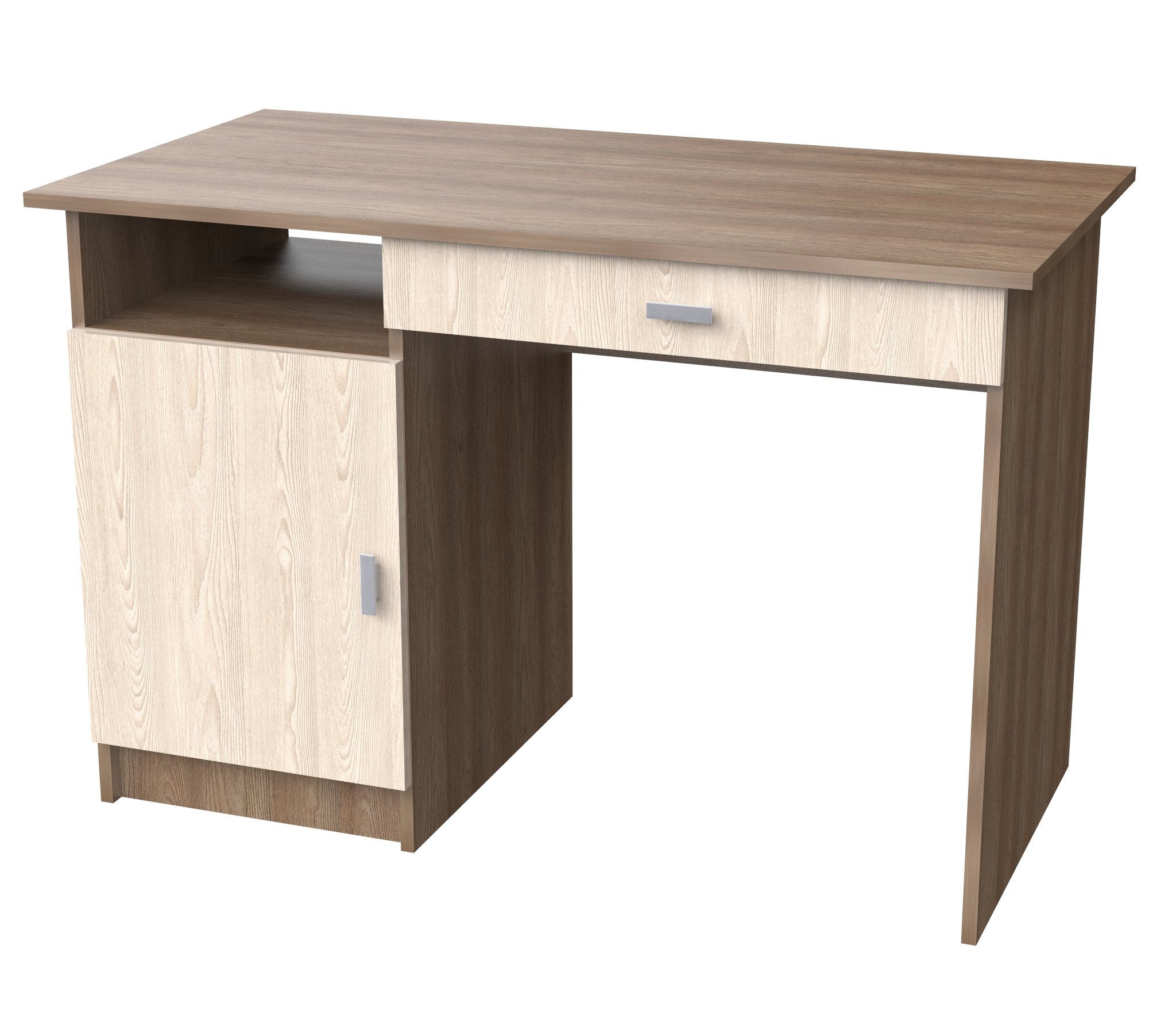 Стол СТ-7 изготовлен из ЛДСП.Оснащён тумбой с дверью,за дверцей полка съёмная+большой ящик с другой стороныСборка только как на фото,на другую сторону не предусмотрено..Ширина 110 см,Выс 75 см,глуб 57 см.Удобен в использовании как для кабинета,так и для школьников.