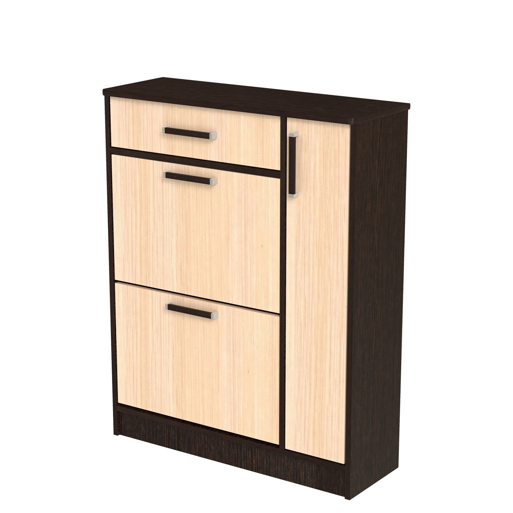 Обувница с двумя откидными нишами под обувь, распашной дверью со съемными полками и выдвижным ящиком. Тумба идеально встанет в Вашей прихожей и не займет много места.Корпус и фасады из качественного ЛДС.Производитель оставляет за собой право менять фурнитуру.