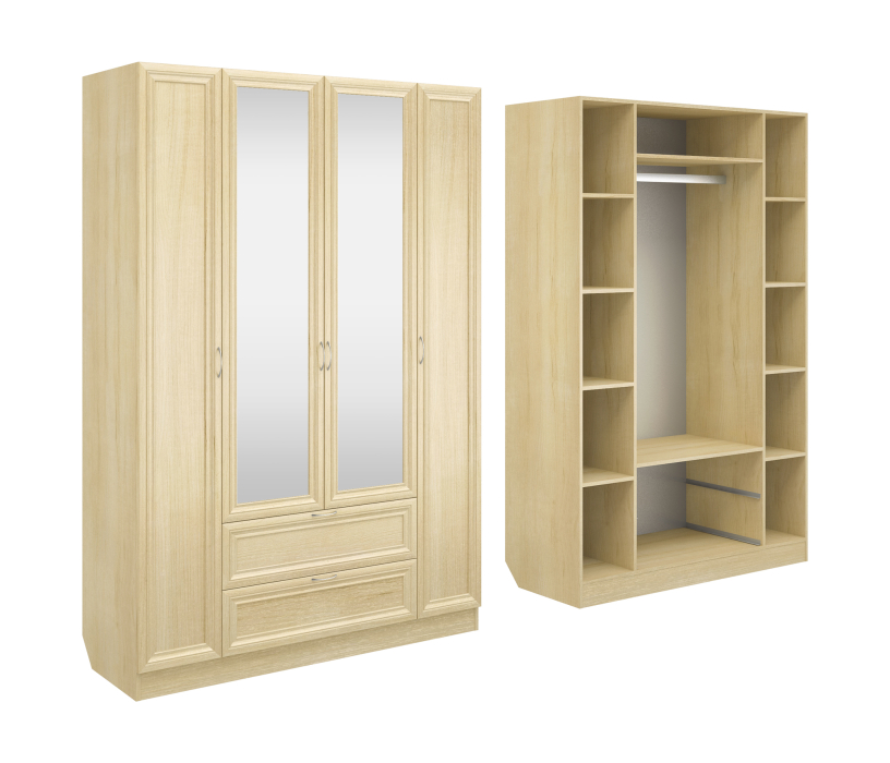 Корпус шкафа выполнен из Ламинированной ДСП высокого качества с насыщенным цветом. Фасады выполнены из материала МДФ.В данной моделе используются зеркала, которые внедрены в рамки фасадов.Шириною 140 см., красивый и удобный четырехстворчатый шкаф. По бокам слева и справа секции, по четыре полки в каждой. В центре сверху узкая ниша, под ней большая секция со штангой для одежды. В самом низу два выдвижных ящика. Два зеркала в данной моделе уже включены в стоимость.