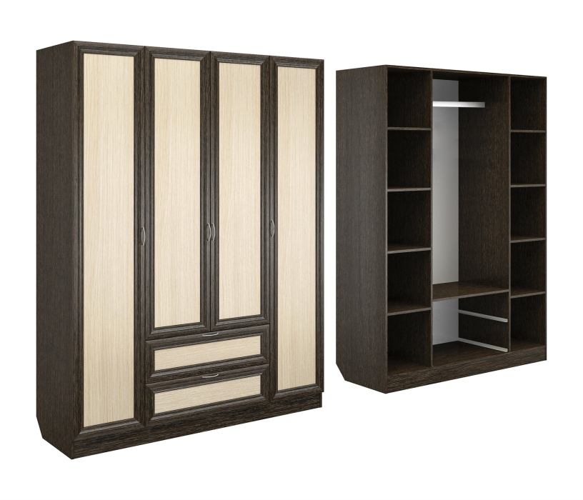 Корпус шкафа выполнен из Ламинированной ДСП высокого качества с насыщенным цветом. Фасады выполнены из материала МДФ.Шириною 160 см., красивый четырехстворчатый шкаф. Слева и справа секции, по четыре полки в каждой.