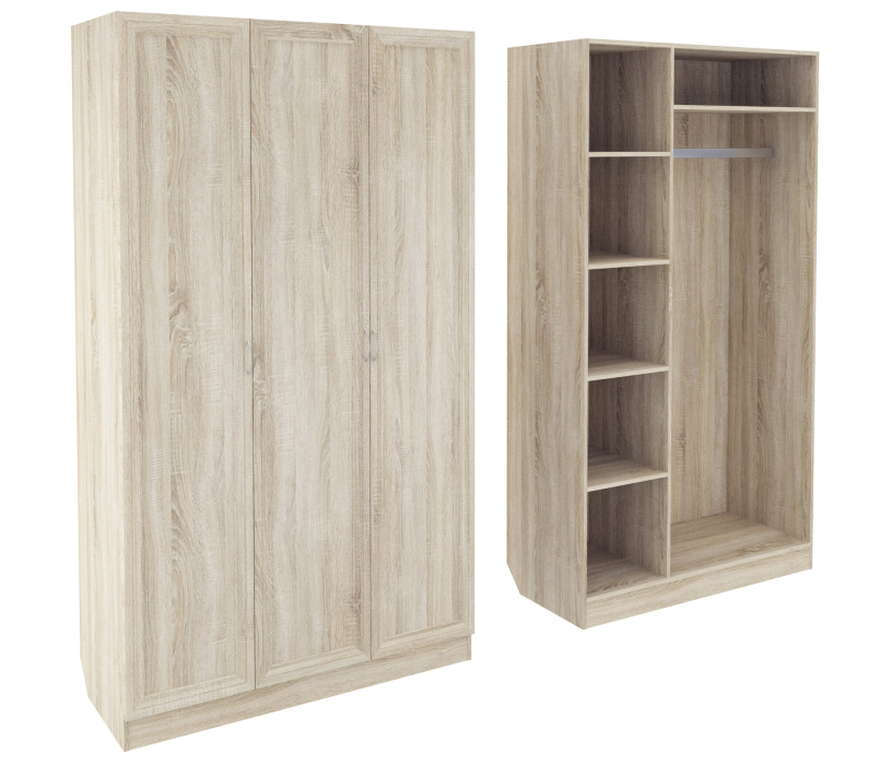 Корпус шкафа выполнен из Ламинированной ДСП высокого качества с насыщенным цветом. Фасады выполнены из материала МДФ.Шириною 110 см., большая и функциональная трёхстворчатая модель. В левой секции ниши для сложенных вещей. Справа штанга для одежды.