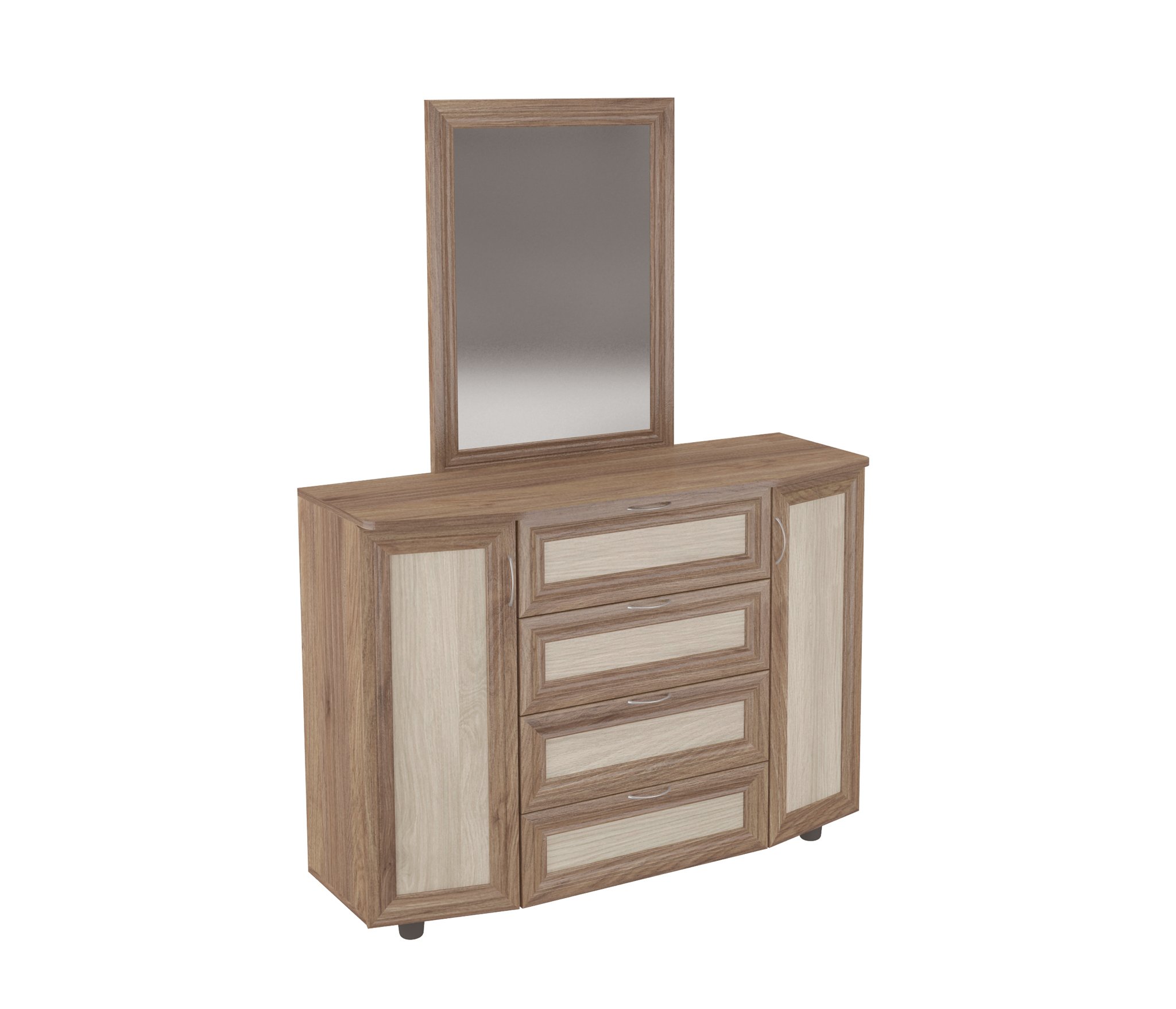 Комод 1 с Зеркалом ,отличается большими размерами и многофункциональностью.4-ре больших выдвижных ящика + 2 двери по бокам скрывают полки,позволяет разместить как крупные,так и мелкие вещи.