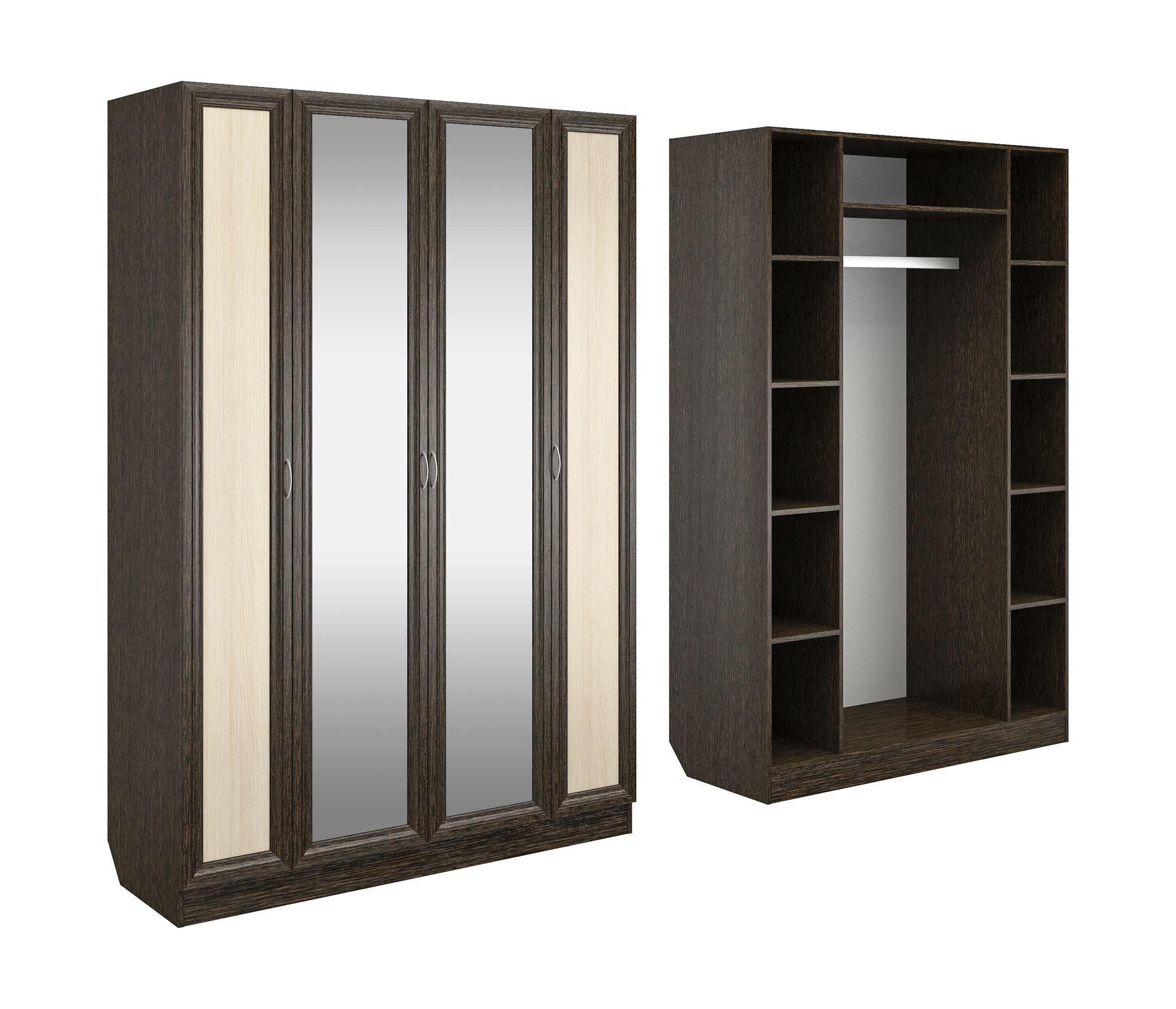 Корпус шкафа выполнен из Ламинированной ДСП высшего качества с насыщенным цветом. Фасады выполнены из материала МДФ.Шириною 140 см., модель с четырьмя створками. Слева и справа секции, по четыре полки в каждой. В центре узкая ниша, а под ней большая секция со штангой. Два зеркала в данной моделе так же включены в стоимость.В данной моделе используются зеркала, которые внедрены в рамки фасадов.
