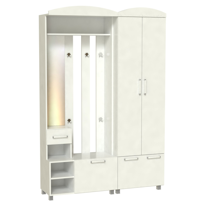 Корпус и фасады прихожей выполнен из Ламинированной ДСП высшего качества с насыщенным цветом. .Шириною 140 см., это небольшой комплект из двух модулей, тумбы-вешалки и шкафа. В шкафу две распашные двери и одна откидная. Во втором модуле небольшое, но высокое зеркальце над маленьким ящиком. Имеются три ниши рядом с откидной дверью. На вешалке пять двойных крючков. Прихожая Шк-7 самое лучшее решение и идеально подходит как для не больших помещений, так и для средних.