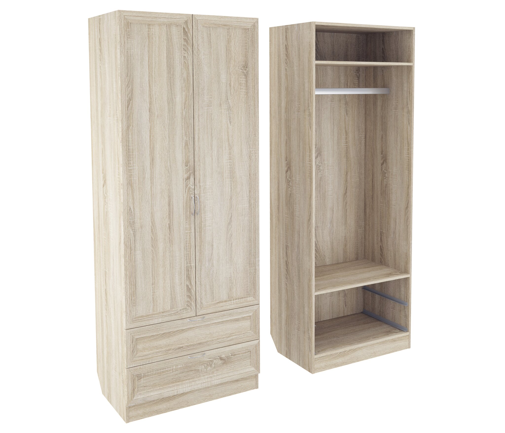 Корпус шкафа выполнен из Ламинированной ДСП высокого качества с насыщенным цветом. Фасады выполнены из материала МДФ.Шириною 80 см., эта многофункциональная модель несет в себе следующие элементы. За распашными дверьми находится штанга для одежды. Внизу расположены два выдвижных ящика.