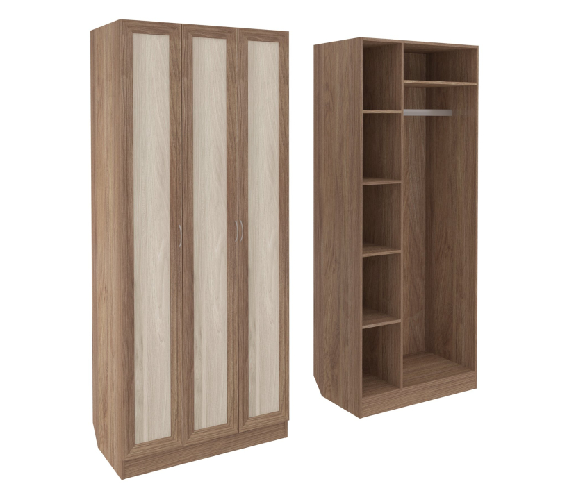 Корпус шкафа выполнен из Ламинированной ДСП высокого качества с насыщенным цветом. Фасады выполнены из материала МДФ.Ширина шкафа 90 см., большая и функциональная трёхстворчатая модель. В левой секции ниши для сложенных вещей. Справа штанга для одежды.