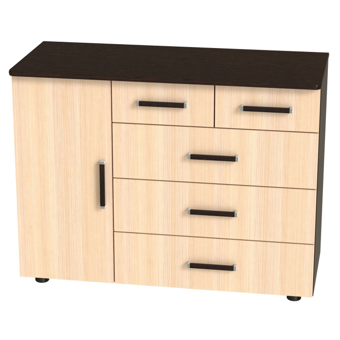 Гамаюн М-7 отличается большими размерами и многофункциональностью.3 больших+2 маленьких выдвижных ящика,позволят разместить множество вещей.Дверь,скрывающая полку,позволяет разместить более крупные вещи.Корпус и фасады из высококачественного ЛДСП..Производитель сохраняет за собой право менять фурнитуру.