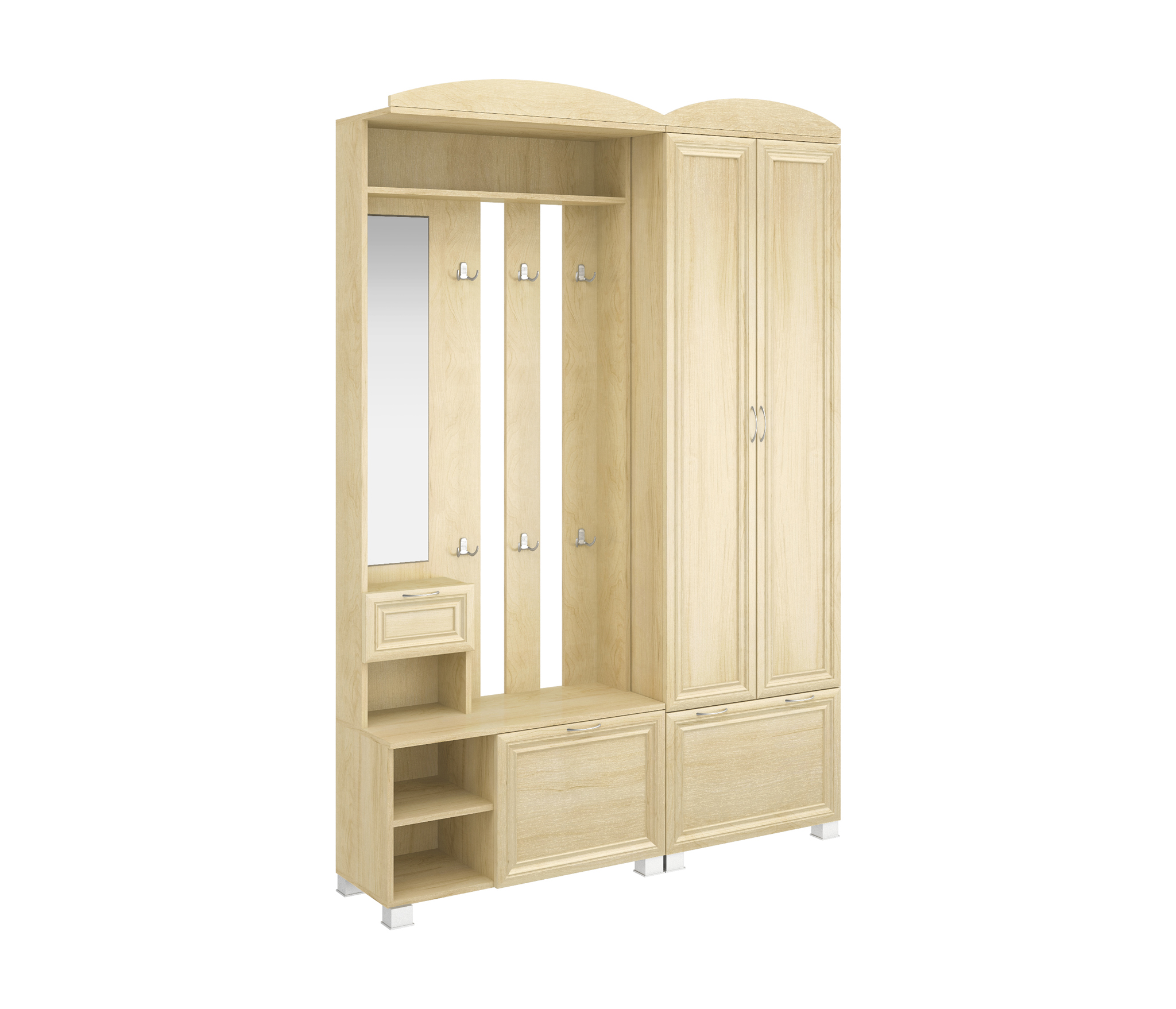 Корпус прихожей выполнен из Ламинированной ДСП высшего качества с насыщенным цветом. Фасады выполнены из материала МДФ и дополнительно укреплены металлическими скобами и силиконом изнутри.Шириною 140 см., это небольшой комплект из двух модулей, тумбы-вешалки и шкафа. В шкафу две распашные двери и одна откидная. Во втором модуле небольшое, но высокое зеркальце над маленьким ящиком. Имеются три ниши рядом с откидной дверью. На вешалке пять двойных крючков. Прихожая Шк-7 самое лучшее решение и идеально подходит как для не больших помещений, так и для средних.