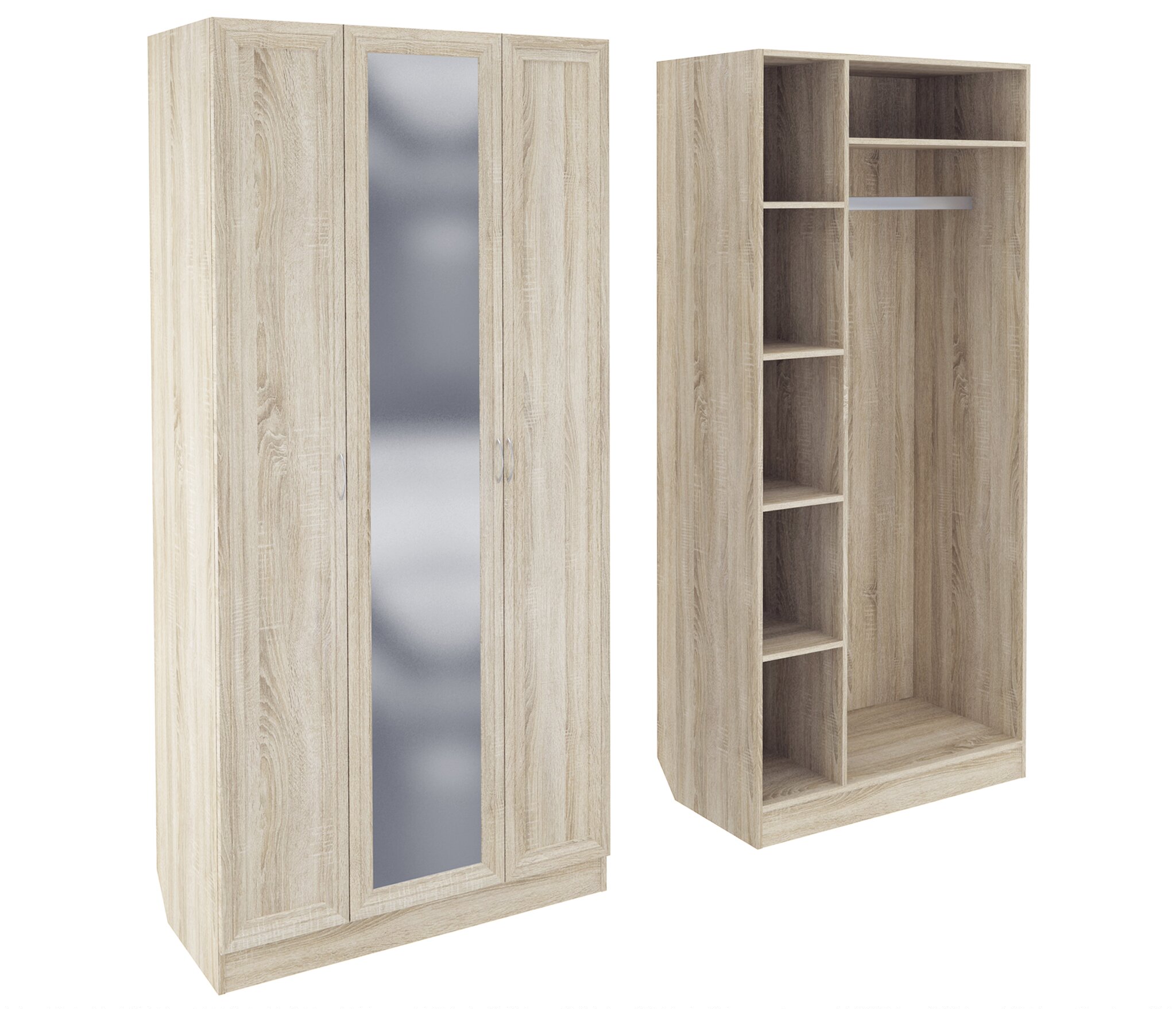Корпус шкафа выполнен из Ламинированной ДСП высокого качества с насыщенным цветом. Фасады выполнены из материала МДФ.Ширина шкафа 100 см., большая и функциональная трёхстворчатая модель. В левой секции ниши для сложенных вещей. Справа штанга для одежды.В данной моделе установлено зеркало, которое монтируется на производстве в рамку фасада двери шкафа