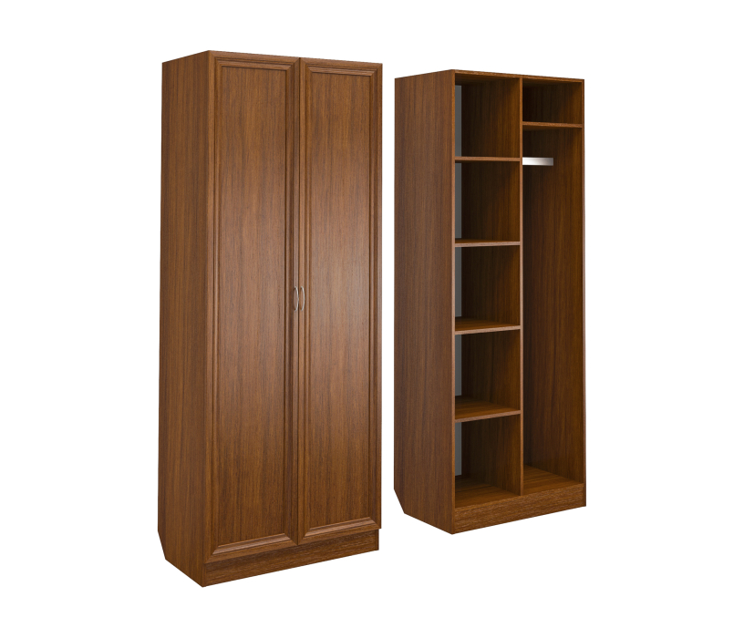 Корпус шкафа выполнен из Ламинированной ДСП высокого качества с насыщенным цветом. Фасады выполнены из материала МДФ.Шириною 80 см., это классический шкаф для верхней одежды, несет в себе следующие элементы. За распашными дверьми с одной стороны отделение с четырьмя полками, с другой штанга для одежды и узкая ниша над ней.