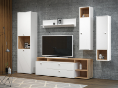Большая тумба под подойдет для для широкоэкранного ТВ. Выдержанна в традициях стиля минимализм, сочетание модного белого цвета с теплым древесным оттенком Дуб золотой.