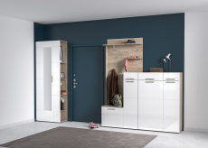 Модель располагает четырьмя открытыми полочками и может использоваться и как торцевой элемент мебельного гарнитура, и как отдельный предмет мебели. При ширине всего 22 см, стеллаж весьма практичен и функционален. На полочках достаточно места для необходимых под рукой мелочей и предметов декора. Универсальная сборка поможет Вам разместить стеллаж в интерьере прихожей с максимальным комфортом. Для безопасной эксплуатации, необходимо крепление модуля к соседним мебельным элементам или к стене. Выполнена мебель в сочетании светлого цвета натурального дуба корпуса из ламинированной ДСП 16 мм, и глянцевых искристо белых МДФ фасадов. Линейная фрезеровка фасадов и периферическая фрезеровка по типу фацета украшают мебель и определяют название коллекции. Установлена на пластиковые опоры высотой 20 мм.