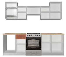 - Корпус кухни изготовлен из 16 мм ламинированной древесностружечной плиты белого цвета. Торцевые поверхности корпуса закромлены кромками ПП и меламин.