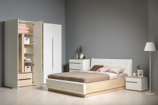 Наполнение шкафа может собрано на любую сторону, два выдвижных ящика скрыты за распашными фасадами, на обратной стороне которых размещается зеркало.