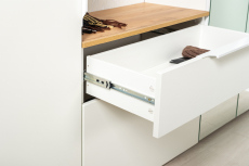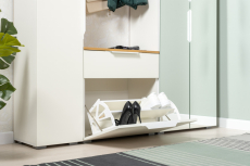 Аккуратная обувница с выдвижным ящиком для мелочей сверху и нишей с откидной дверкой с полками для обуви снизу. Отделение с откидной дверкой с полками вмещает до 6 пар невысокой обуви. Шариковые направляющие полного выдвижения обеспечивают тихую эксплуатацию выдвижного ящика. Металлические ручки выполнены из алюминиевого профиля надежно крепятся и удобно ложатся в руку. Визуально может показаться, что мебель без ручек. Такая видимость создается из-за того, что профиль крепится к торцовой части дверей и ящика. Тумба для обуви оснащена пластиковыми опорами серого цвета.