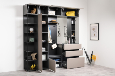 Сидней – стильная и функциональная прихожая, которая масштабируется под любую площадь помещения и высоту потолков. Минималистичные фасады в трендовом цвете без лицевой фурнитуры открываются за край либо нажатием (push-to-open). Большой выбор модулей: высота шкафов от 2050 до 2400 мм и полноразмерная глубина позволит максимально использовать полезное пространство. Вместительная система для хранения одежды, обуви и хозяйственных принадлежностей. Цветовое решение: ЛМДФ 16 мм Веллюто Капучино; ЛДСП 16 мм Антрацит.