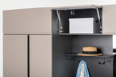 Сидней – стильная и функциональная прихожая, которая масштабируется под любую площадь помещения и высоту потолков. Минималистичные фасады в трендовом цвете без лицевой фурнитуры открываются за край либо нажатием (push-to-open). Большой выбор модулей: высота шкафов от 2050 до 2400 мм и полноразмерная глубина позволит максимально использовать полезное пространство. Вместительная система для хранения одежды, обуви и хозяйственных принадлежностей. Цветовое решение: ЛМДФ 16 мм Веллюто Капучино; ЛДСП 16 мм Антрацит.