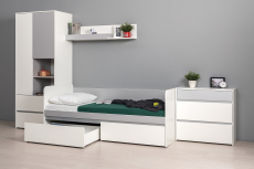 В основании кровати оборудованы два выдвижных ящика для постельных принадлежностей и личных вещей ребёнка. Ящики достаточно вместительные и установлены на колесные опоры, что обеспечивает им легкое выдвижение. Отсутствие лицевой фурнитуры и открывание фасадов за край - не только стилевое, но функциональное решение. Так мебель занимает меньше места и дает возможность проходить вплотную с фасадом без риска зацепиться за ручку или травмироваться. Базовый белый цвет, сочетаясь с акцентным серым, создаёт нейтральную основу интерьера, чтобы подчеркнуть личные вещи и аксессуары. Корпуса и фасады мебели изготовлены из экологически чистой ламинированной ДСП 16 мм, торцы окромлены ПХВ плёнкой 0,4 мм. В производстве молодёжной Торонто использованы качественные материалы и фурнитура - можно разрабатывать проект на весь период обучения. Поставляется кровать с ящиками Торонто 11.39 в разобранном виде, надёжно упакованной в гофрокартон, с приложенной подробной инструкцией по сборке. Выполнена в цвете: белая шагрень/стальной серый. Материалы изготовления: ламинированная ДСП 16 мм, кромка ПВХ.
