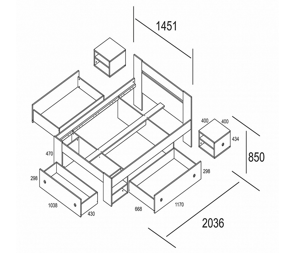 В комплекте: три ящика для белья, две выдвижные тумбы прикроватные. Матрас и Основание для кровати в комплект не входит.