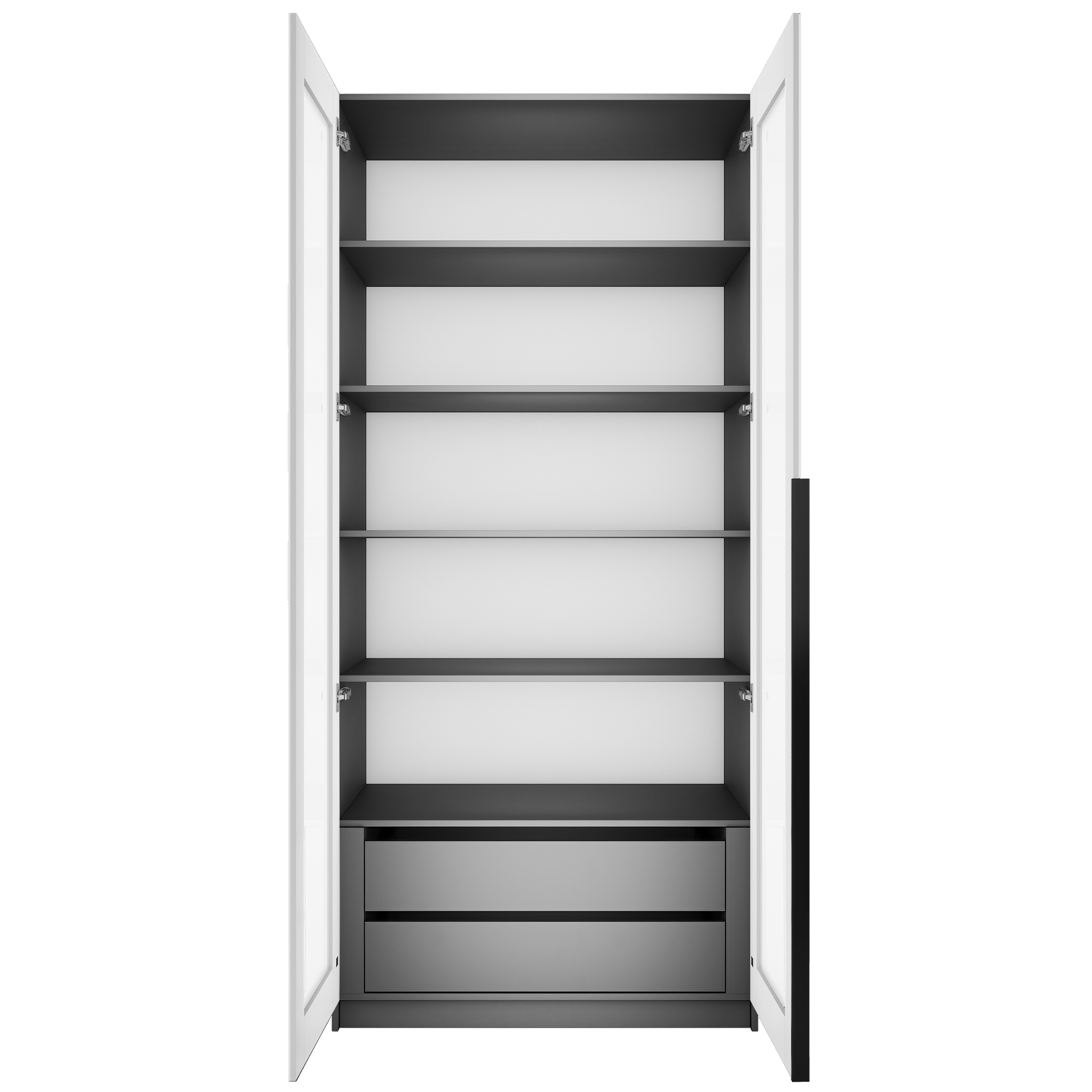 Фасады шкафа изготовлены из стекла белого цвета, оклеенного противоосколочной пленкой с внутренней рамкой из ЛДСП Белый снег.