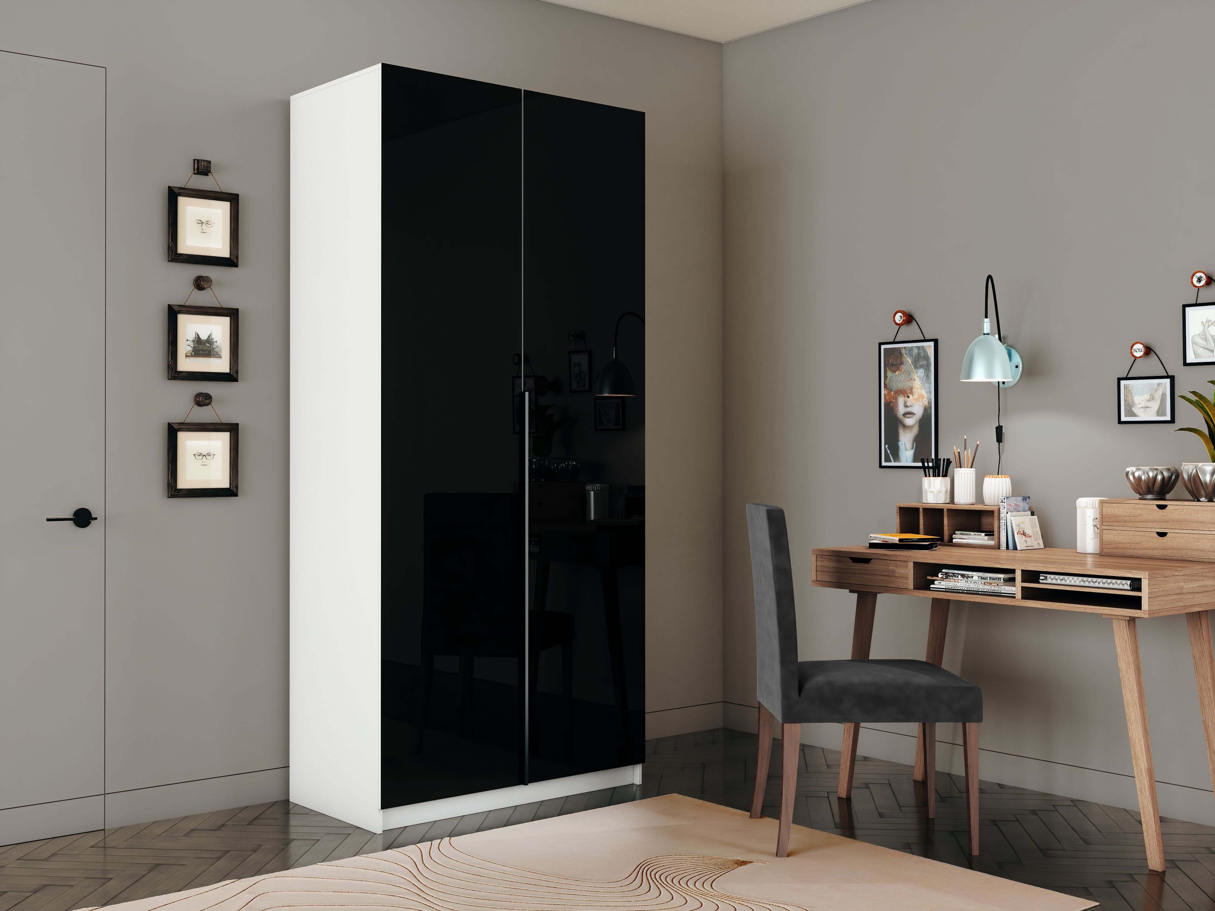 Шкаф распашной Е1 Локер 101x52.5x220 см, с черным стеклом , полками и модулем (Белый снег)