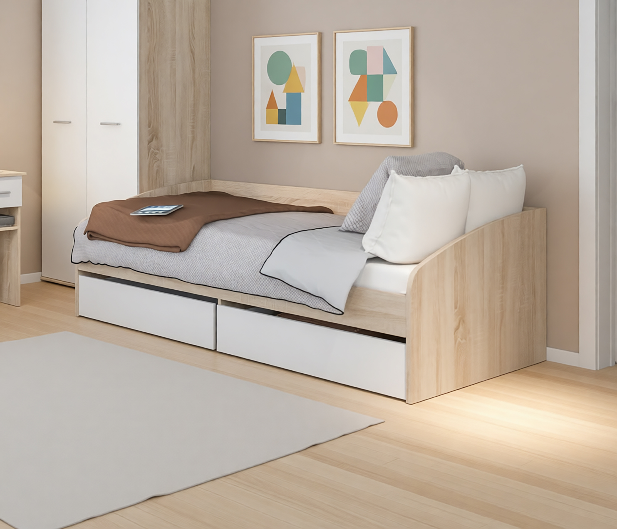 Модель производится из современного материала КДСП. Отделка комбинированная – корпус в цвете «Дуб Сонома», фасадные поверхности белые.