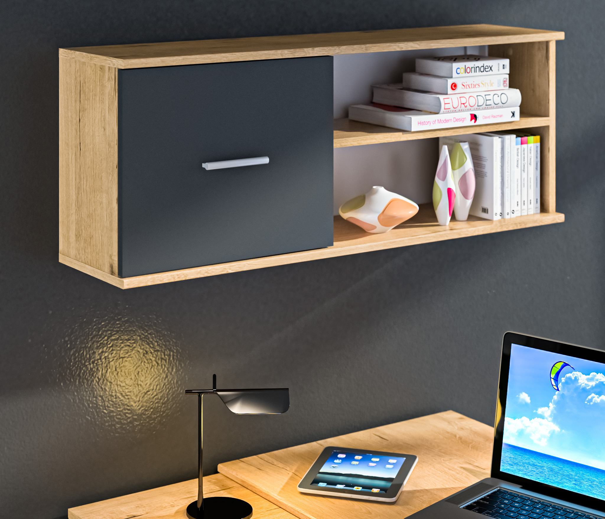 Модель производится из современного материала КДСП. Отделка комбинированная – корпус в цвете «Дуб Сонома», фасадные поверхности белые.