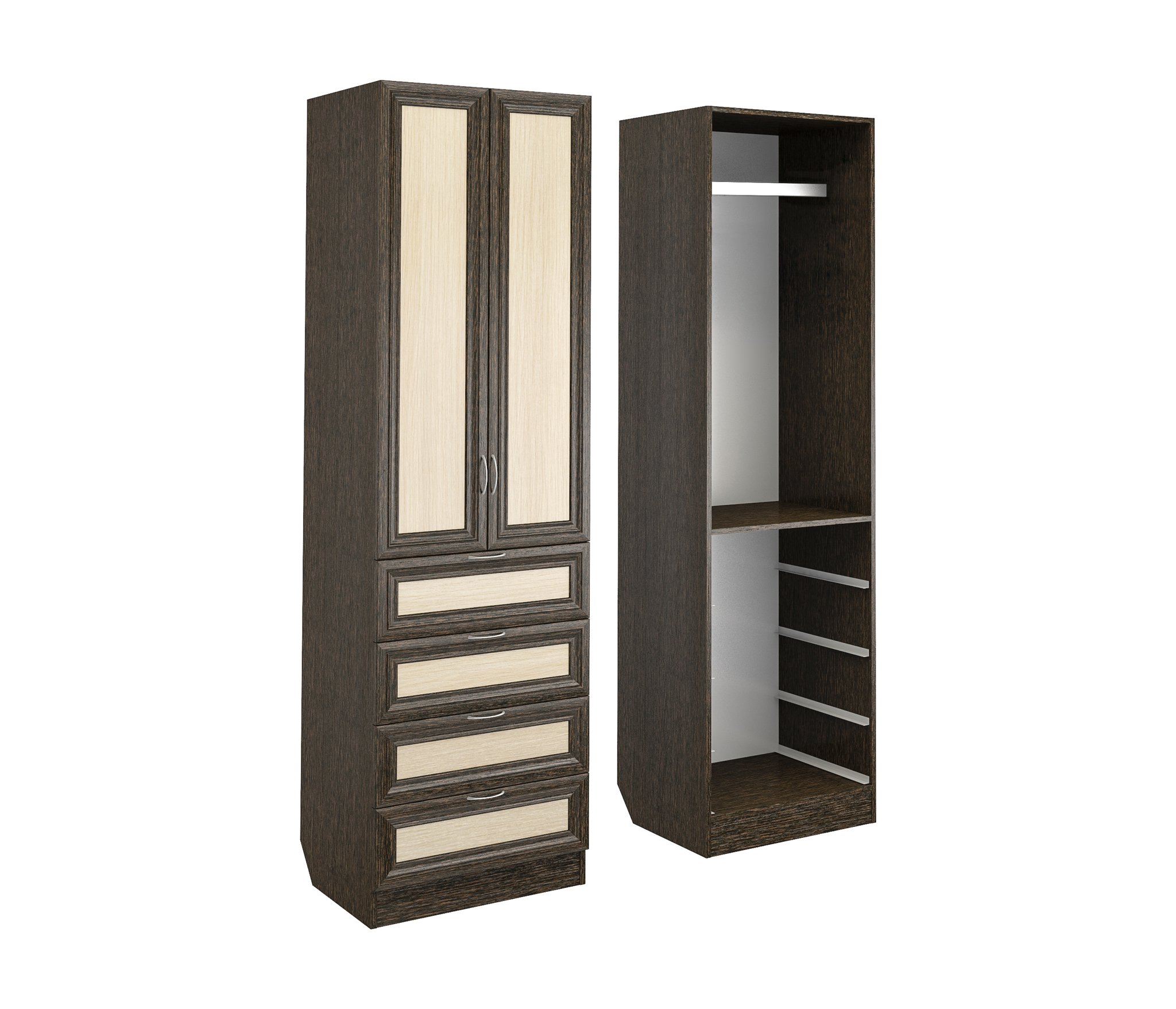 Корпус шкафа выполнен из Ламинированной ДСП высокого качества с насыщенным цветом. Фасады выполнены из материала МДФ.Шириною 60 см., эта многофункциональная модель несет в себе следующие элементы. За распашными дверьми штанга для одежды, вверху ниша. Снизу четыре выдвижных ящика.