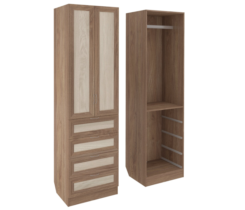 Корпус шкафа выполнен из Ламинированной ДСП высокого качества с насыщенным цветом. Фасады выполнены из материала МДФ.Шириною 60 см., эта многофункциональная модель несет в себе следующие элементы. За распашными дверьми штанга для одежды, вверху ниша. Снизу четыре выдвижных ящика.