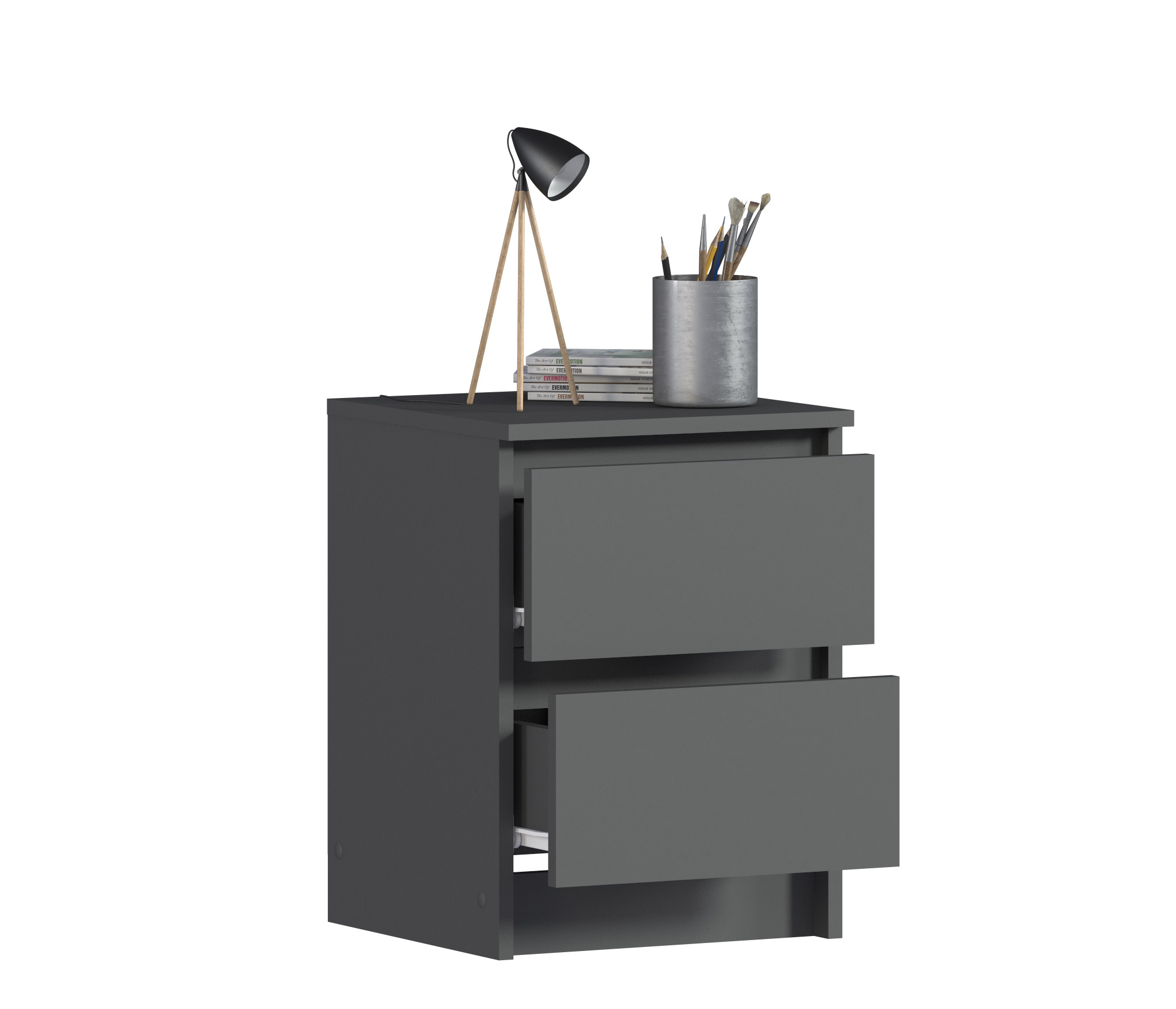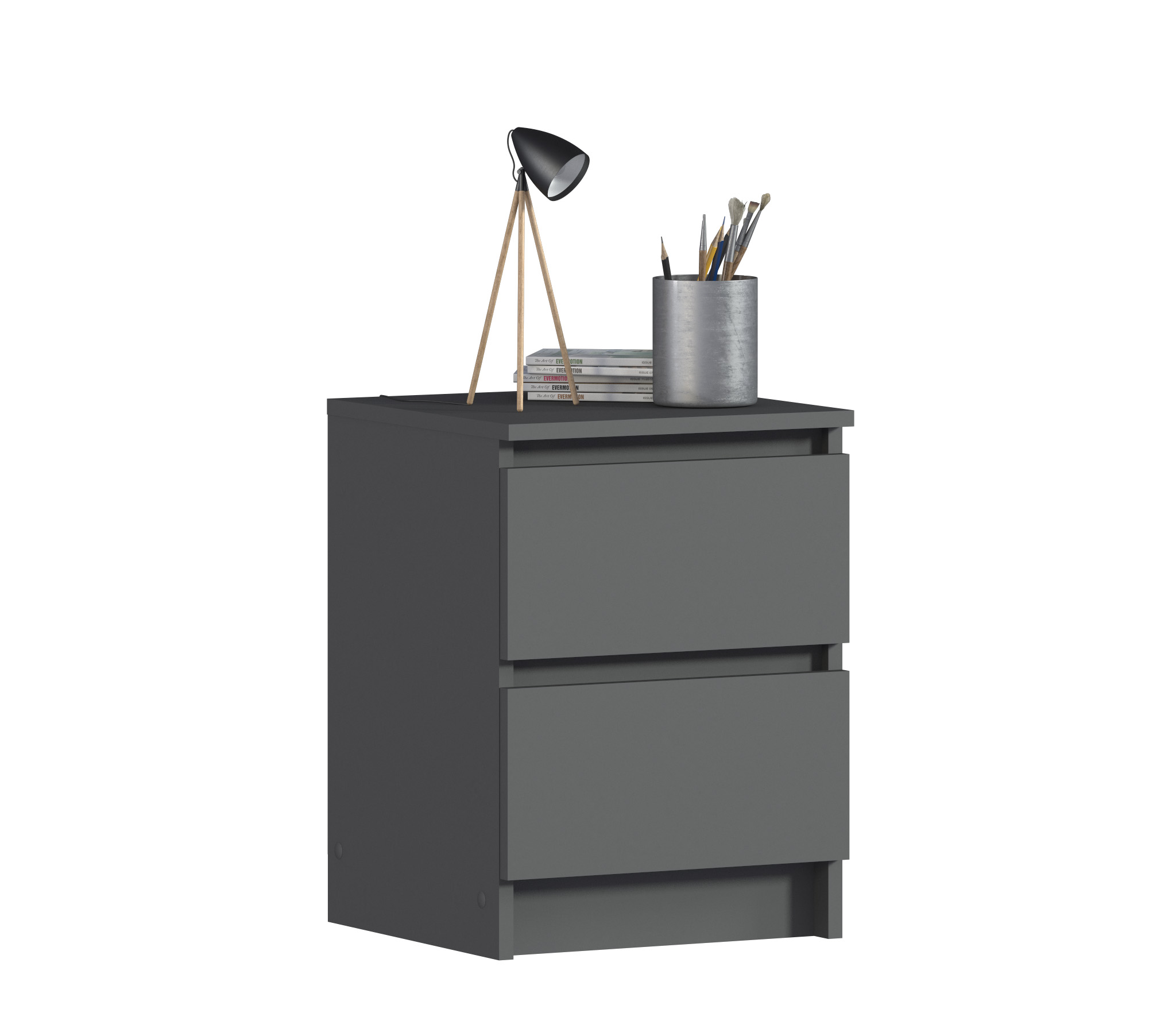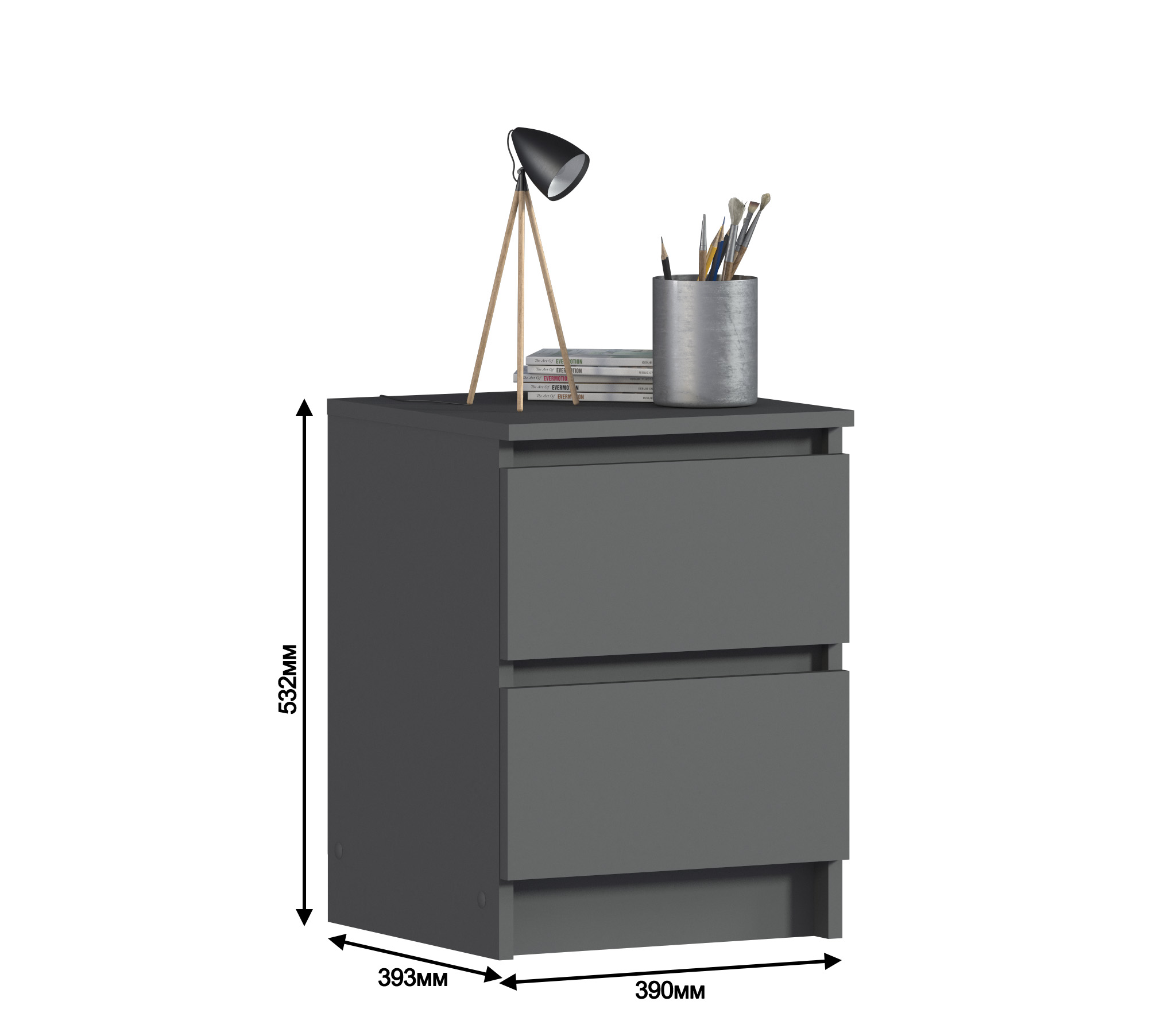 Габаритные размеры тумбы довольно компактны - ширина 39 см, высота 53 см, глубина 39 см. Под столешницей расположены два ящика, оснащенных прочными выдвижными механизмами. Тумба идеально подойдет для оформления вашей спальни или детской в современном стиле. Тумба выполнена из прочного современного КДСП.