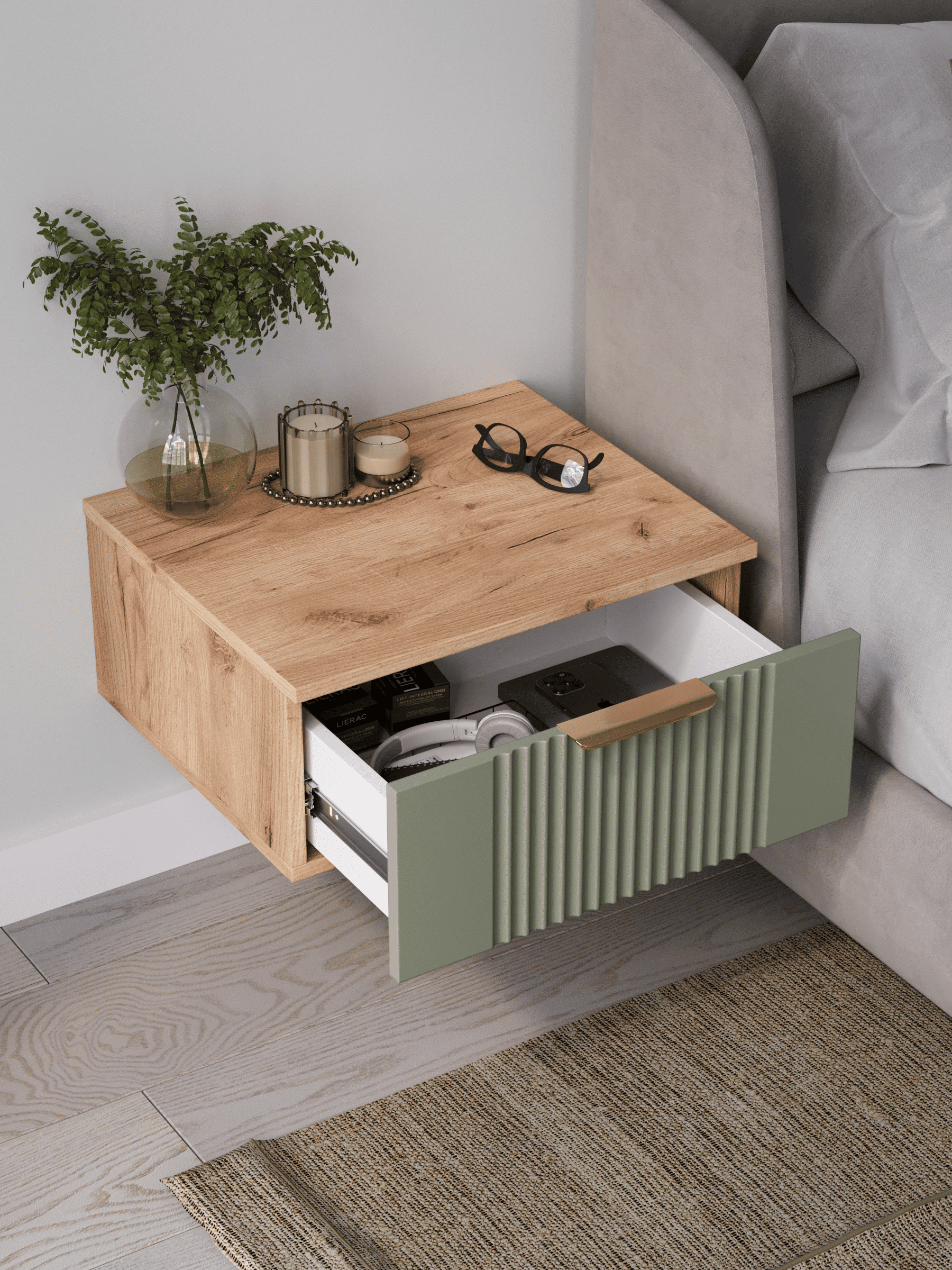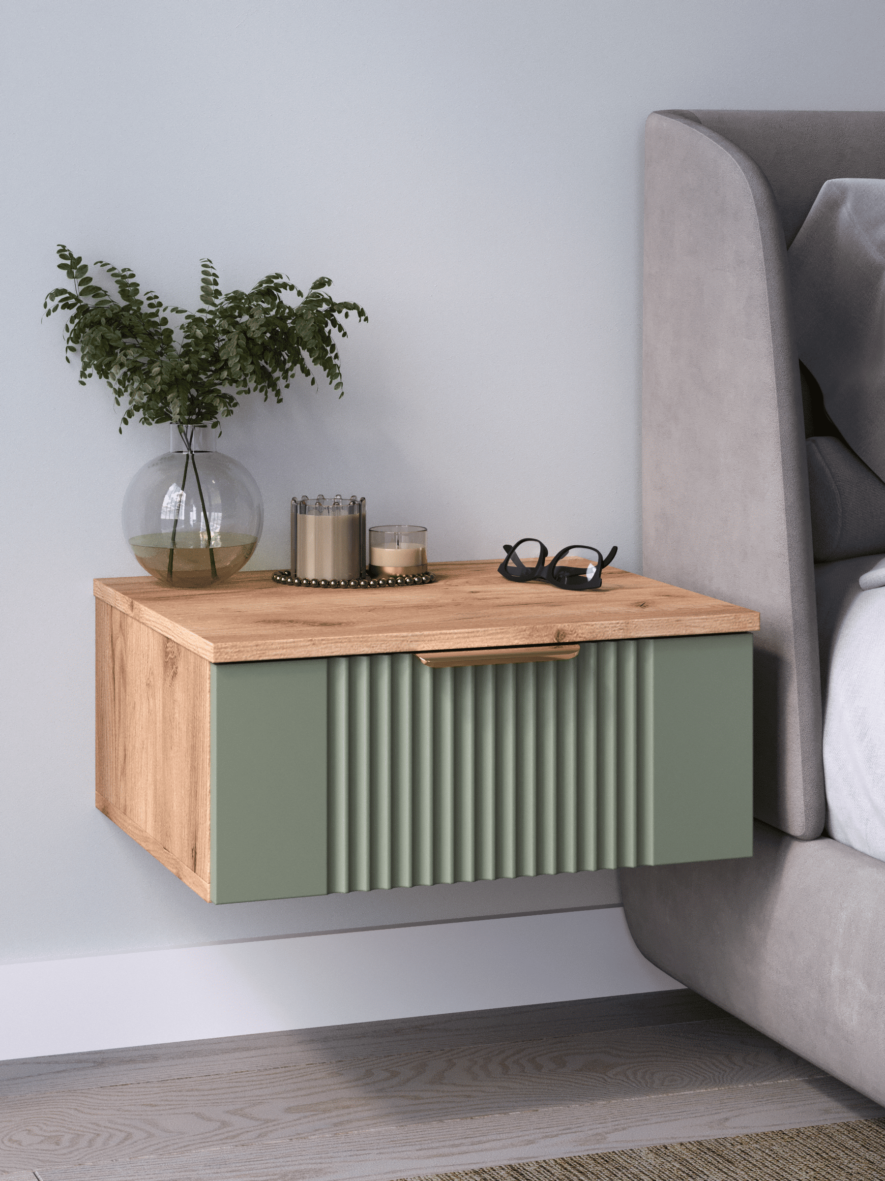 Подвесная прикроватная тумба с ящиком, соединяет в себе комфорт, функциональность и эстетику. Сегодня в тренде – стильные подвесные тумбы. Наша тумба подвесная российского производства выглядят легко и современно, идеально впишется в лофт, скандинавский, современный, минимализм и прочие популярные стили интерьеров. Ее минималистичный дизайн, невесомая конструкция и поразительная вместительность - придадут легкость и простор всему вашему интерьеру. Консоль подвесная размером 50х22х42 (ДхВхГ) см, сэкономит пространство и организует грамотное хранение вещей. Шкафчик навесной изготовлен из материалов высокого качества. За высокопрочность и долговечность отвечает корпус, выполненный из ЛДСП, подходит для активного использования. За эстетику и лаконичность дизайна отвечает фасад из МДФ созданный путем сложной фрезеровки в виде стильного 3D рисунка. Наша тумба прикроватная подвесная оснащена системой открывания push to open, которая подчеркивает монолитный образ. За удобство и комфорт открывания отвечают шариковые направляющие (без доводчиков). Ящик с такой системой открывания будет ходить практически бесшумно и выдвигаться полностью, даже при повышенной нагрузке (до 8 кг). Сборка этой узкой тумбы не требует особых навыков и не отнимет много времени. В комплекте для сборки настенного комода вы найдете все необходимые комплектующие и фурнитуру, что позволит вам легко и быстро собрать ее самостоятельно. Современная мебель должна не только брать на себя пару задач по организации пространства, но и гармонично смотреться. С этой задачей в интерьере справится шкаф с ящиком, который можно использовать в качестве прикроватной тумбы для хранения необходимых предметов рядом с кроватью в спальне. Тумбочка также может стать отличным туалетным столиком, где можно поместить любимую косметику и аксессуары для ухода за собой. Тумба прикроватная Ингрия-1 отлично прослужит как тумба в прихожую или в коридор, внутри нее можно хранить ключи или другие мелкие предметы. Благодаря возможности навесить тумбу на стену на нужной высоте, появится возможность оптимально использовать пространство комнаты. Это особенно актуально для небольших помещений, где каждый квадратный метр имеет значение. Особенно полезной полка с выдвижным ящиком будет в офисных помещениях, так как эта офисная тумба придаст лаконичности и удобства любому помещению. Тумба навесная Ингрия найдет применение и в салонах красоты и в детских комнатах. Почувствуйте себя дизайнером создайте уют с помощью нашей многофункциональной ниши для хранения.