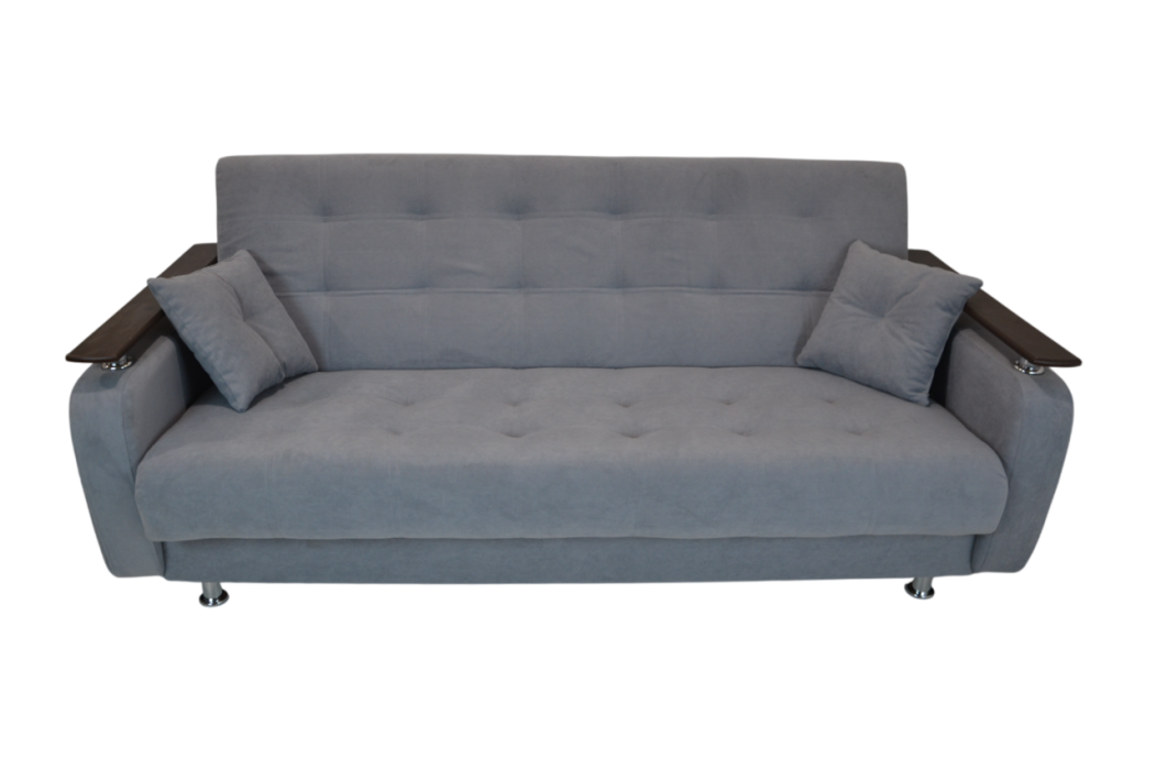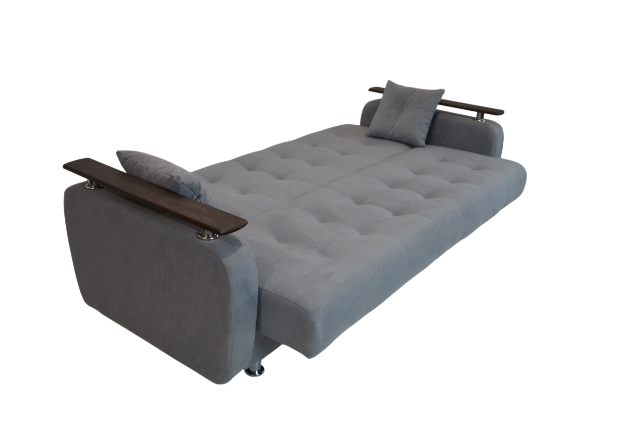 Габариты: 2100*900*1100; Спальное место: 1850*1200. Материалы: пиломатериал хвойных пород, фанера, ДВП, ДСП. Ткань велюр. Синтепон, войлок, пружинный блок. Ящик для белья. На подлокотниках декоративные элементы из МДФ.