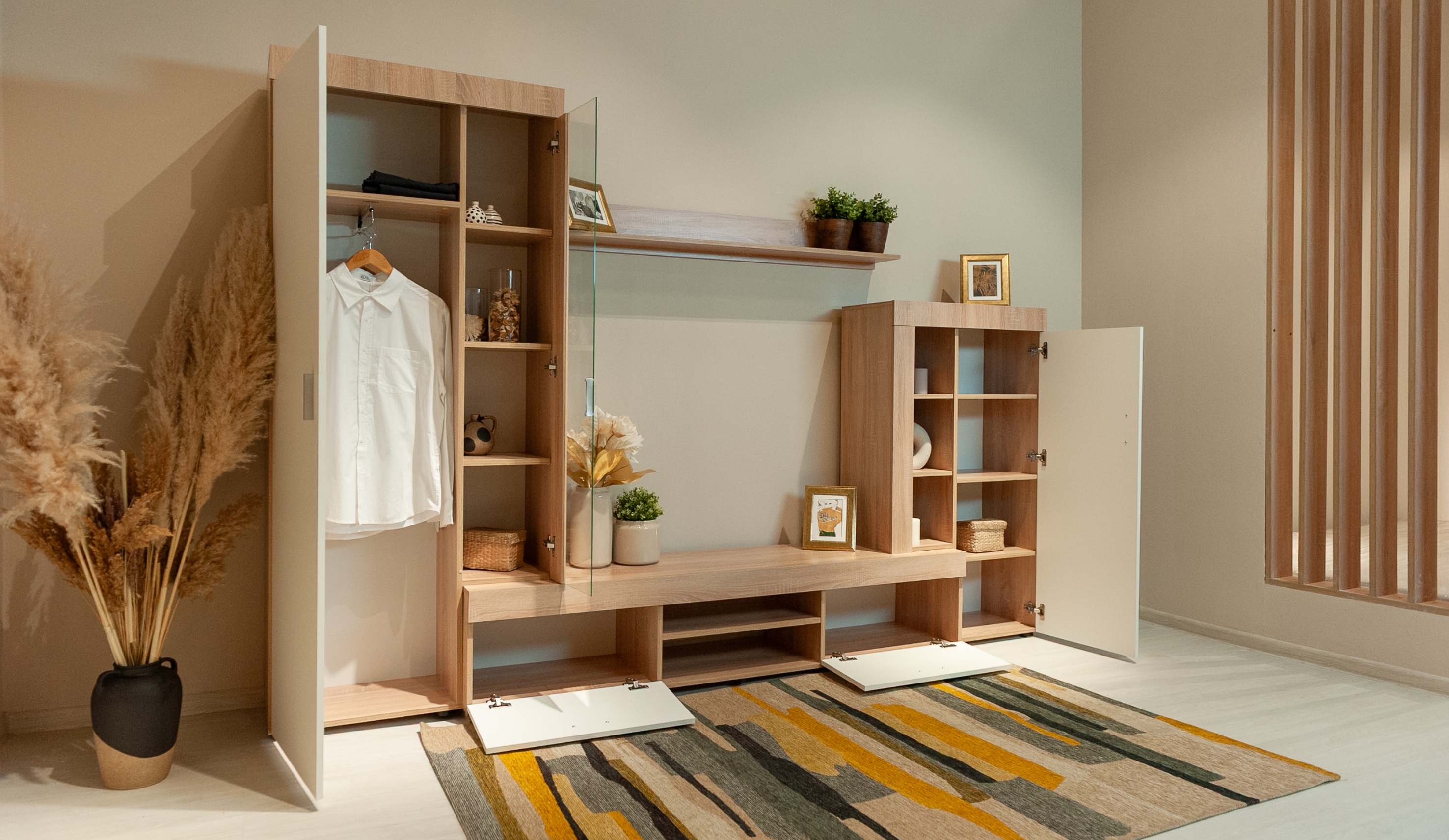 Стенка «Орфей» – яркий представитель стиля минимализма. Стилистическим акцентом являются утолщенные линии корпуса, которые придают выразительность и брутальность стенке. Природная гамма цветов декора – теплый «дуб сонома» и прохладный «белый» создают комфортное светлое пространство. В стенке предусмотрены открытые и закрытые отделения для хранения вещей, медиааппаратуры и TV. Полноценный платяной шкаф с выдвижной поперечной штангой дополнительно можно укомплектовать полками. Материалы стенки экологически чисты и безопасны.