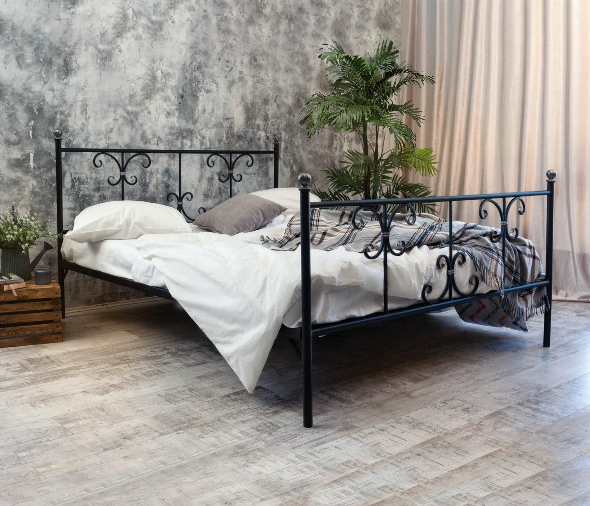 Кованая кровать Симона - это невероятное сочетание эффектного внешнего вида, потрясающих воображение результатов ручной ковки, стильного оформления в темных и светлых цветах и качественных, долговечных материалов исполнения.