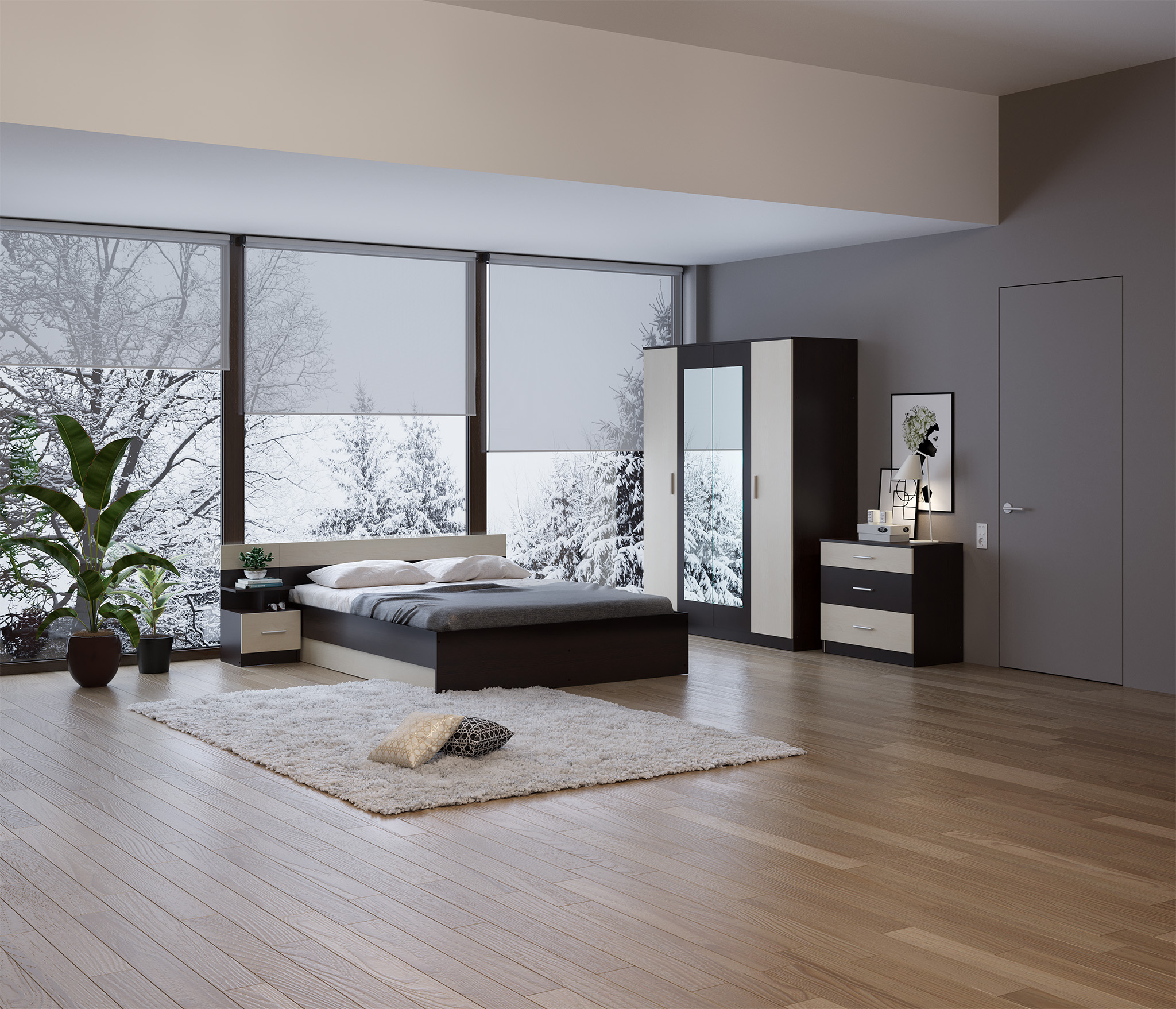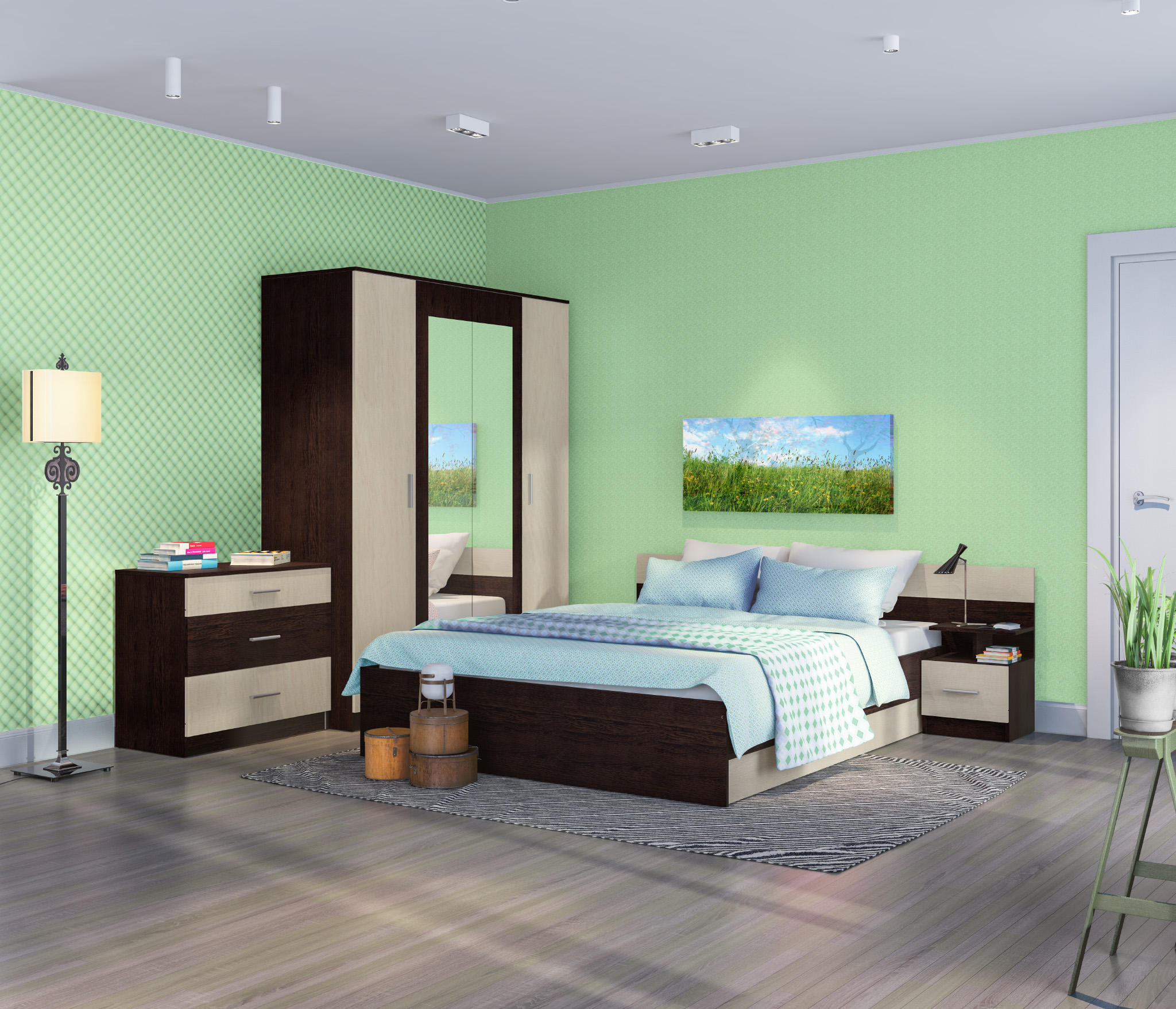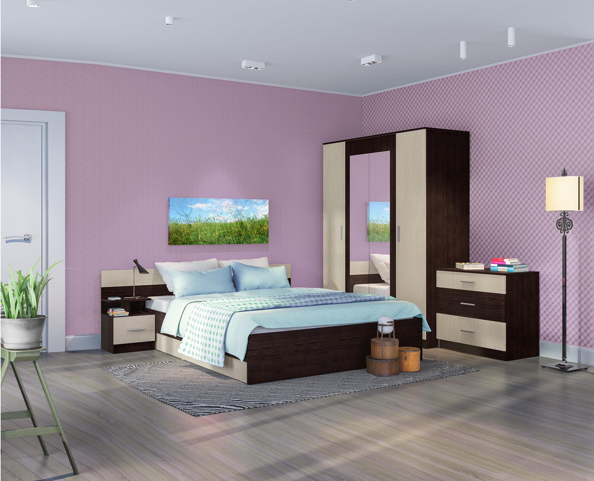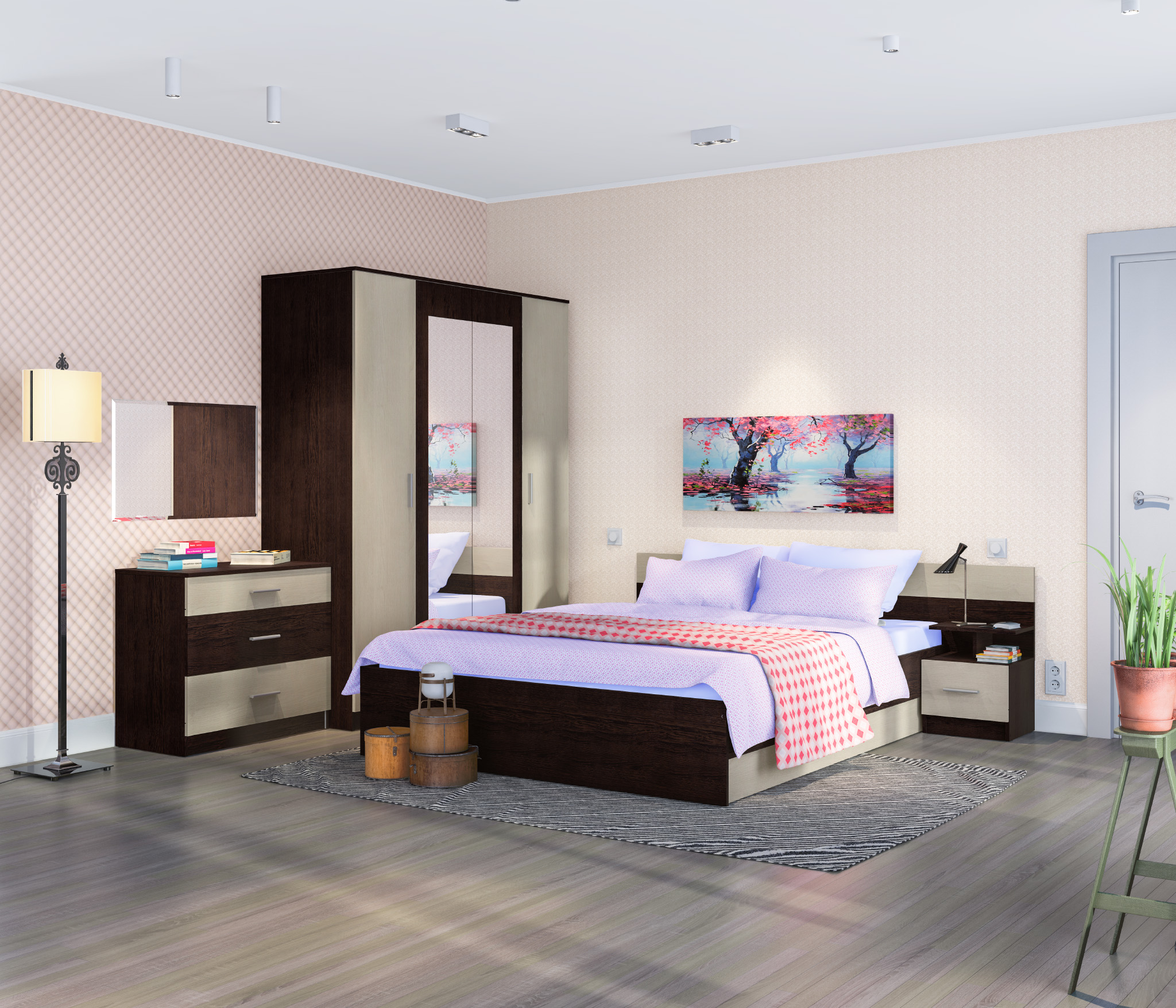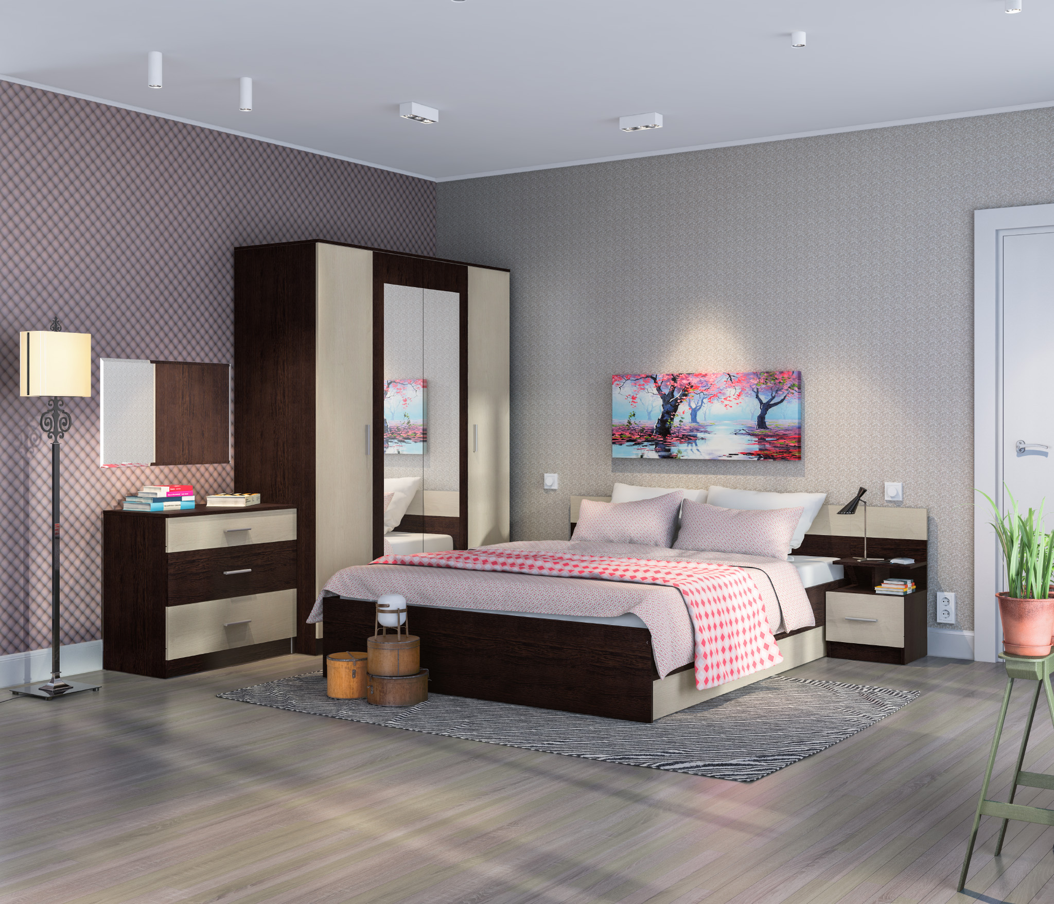 В данный комплект входит: Шкаф 4-х дверный, кровать, комод и одна прикроватная тумба. У кровати стандартное основание из ЛДСП.