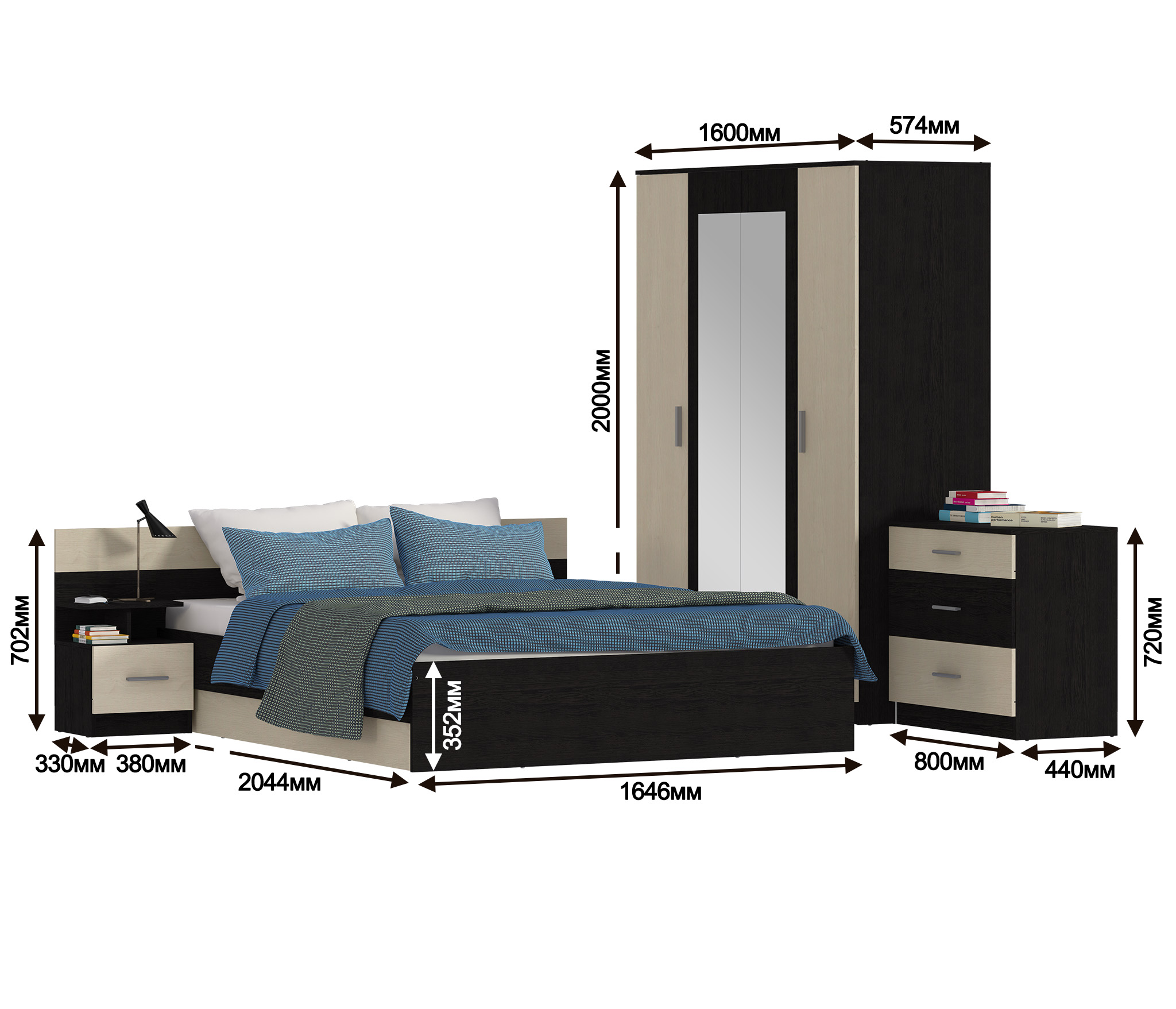 В данный комплект входит: Шкаф 4-х дверный, кровать, комод и одна прикроватная тумба. У кровати стандартное основание из ЛДСП.