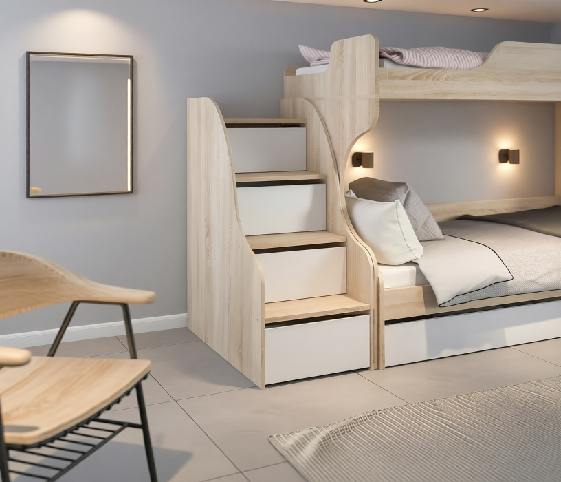 Приставная лестница для кровати служит дополнительным элементом к кровати-чердаку Мамбо СБ-2871. Ящики можно использовать для хранения.