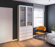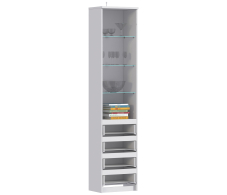 При компактных размерах – ширина 50 см, высота 222 см и глубина 35 см, это довольно вместительная витрина, которая позволит решить вопросы, связанные с хранением памятных вещей. Визуально витрина разделена на два отделения – верхнее – выставочное, находится за прозрачной дверцей и имеет четыре полки. Нижнее включает четыре вместительных выдвижных ящика.